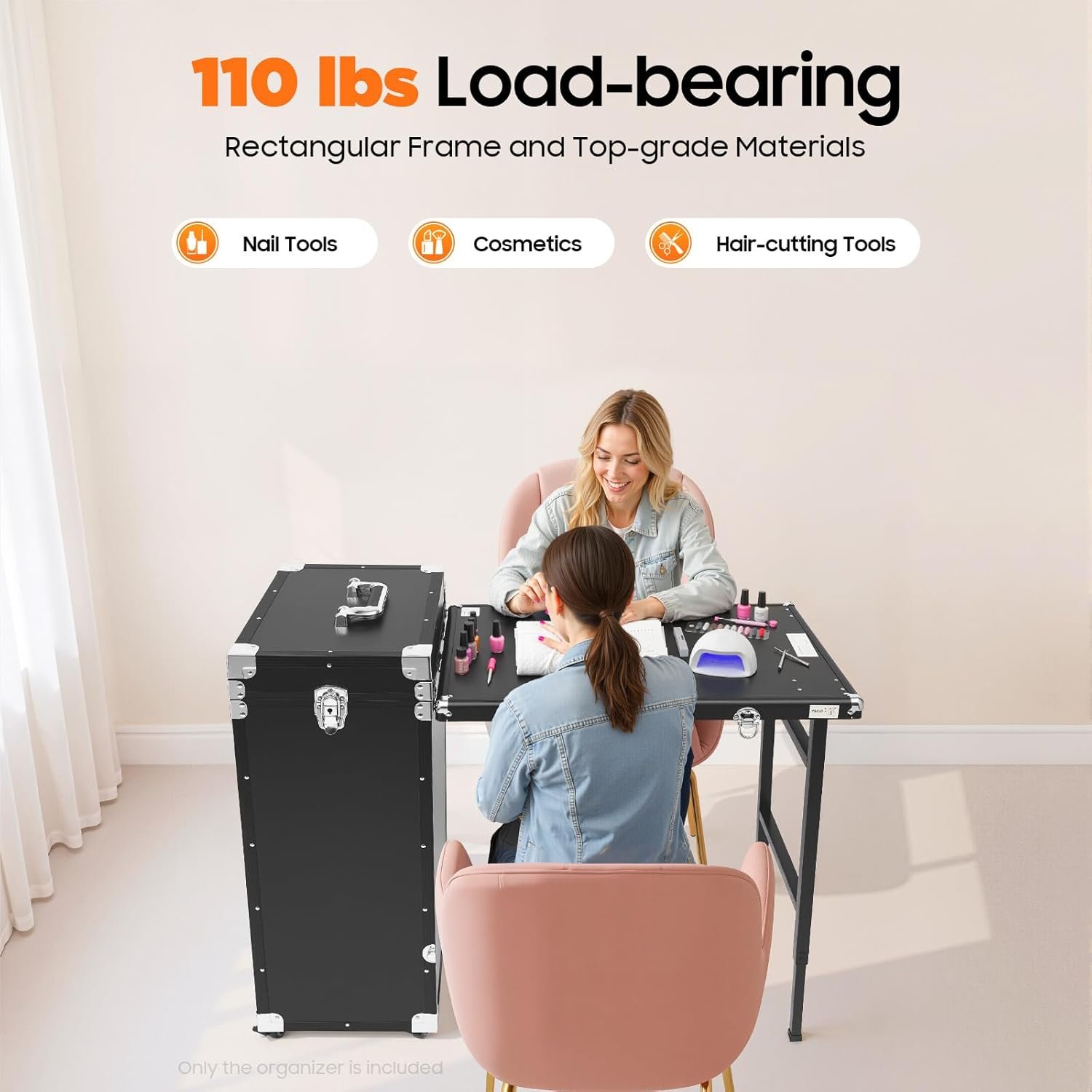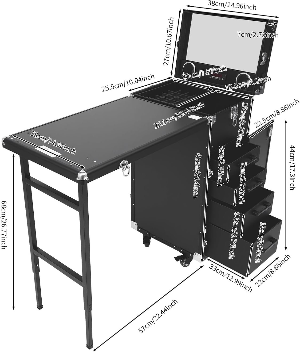 【MOBILE MAKEUP ROOM】 The Foldable nail table is equipped with 4 universal wheels, all with lockable brakes. It is also equipped with an extendable floor work table that converts into an additional makeup work table and a portable mirror for indoor and outdoor makeup application. It consists of a foldable table, an upper compartment with slots for small items and a lower compartment with 4 removable drawers for organizing different items into one box to fully meet your storage needs.