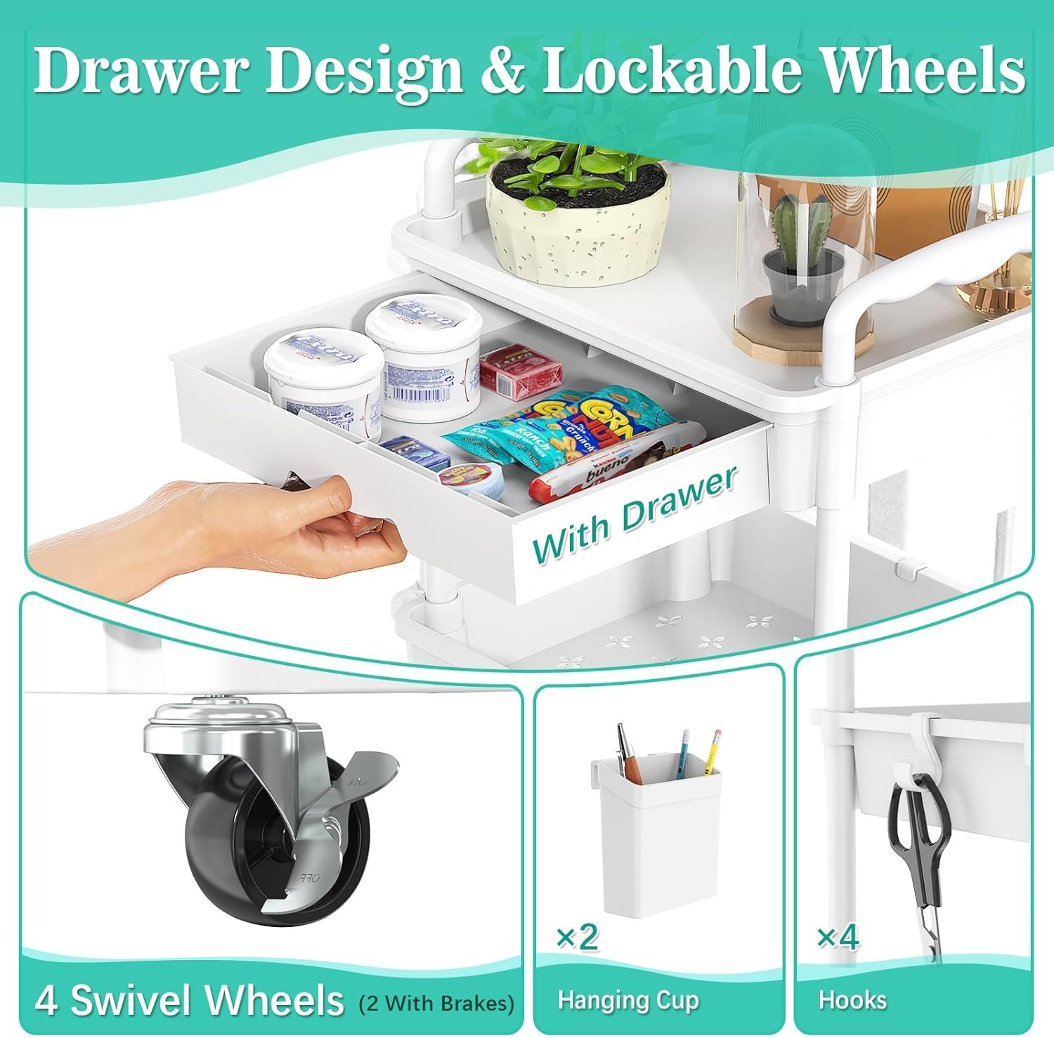 Durable & Versatile for Any Space! This utility cart with wheels crafted from sturdy plastic, this cart withstands daily use in humid bathrooms, busy kitchens, cramped dorms, or home offices. It’s your ultimate multi-functional solution for various purposes, such as a baby stroller, makeup trolley, diaper caddy, bedside organizer, snack cart, and more.