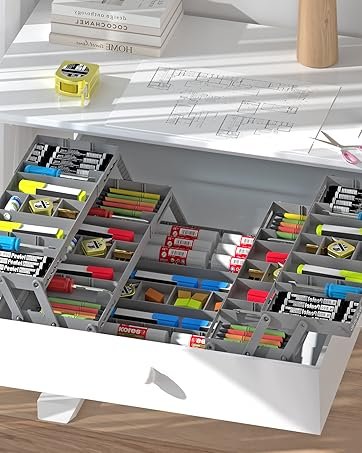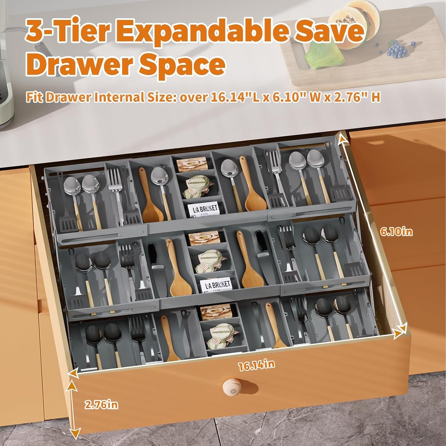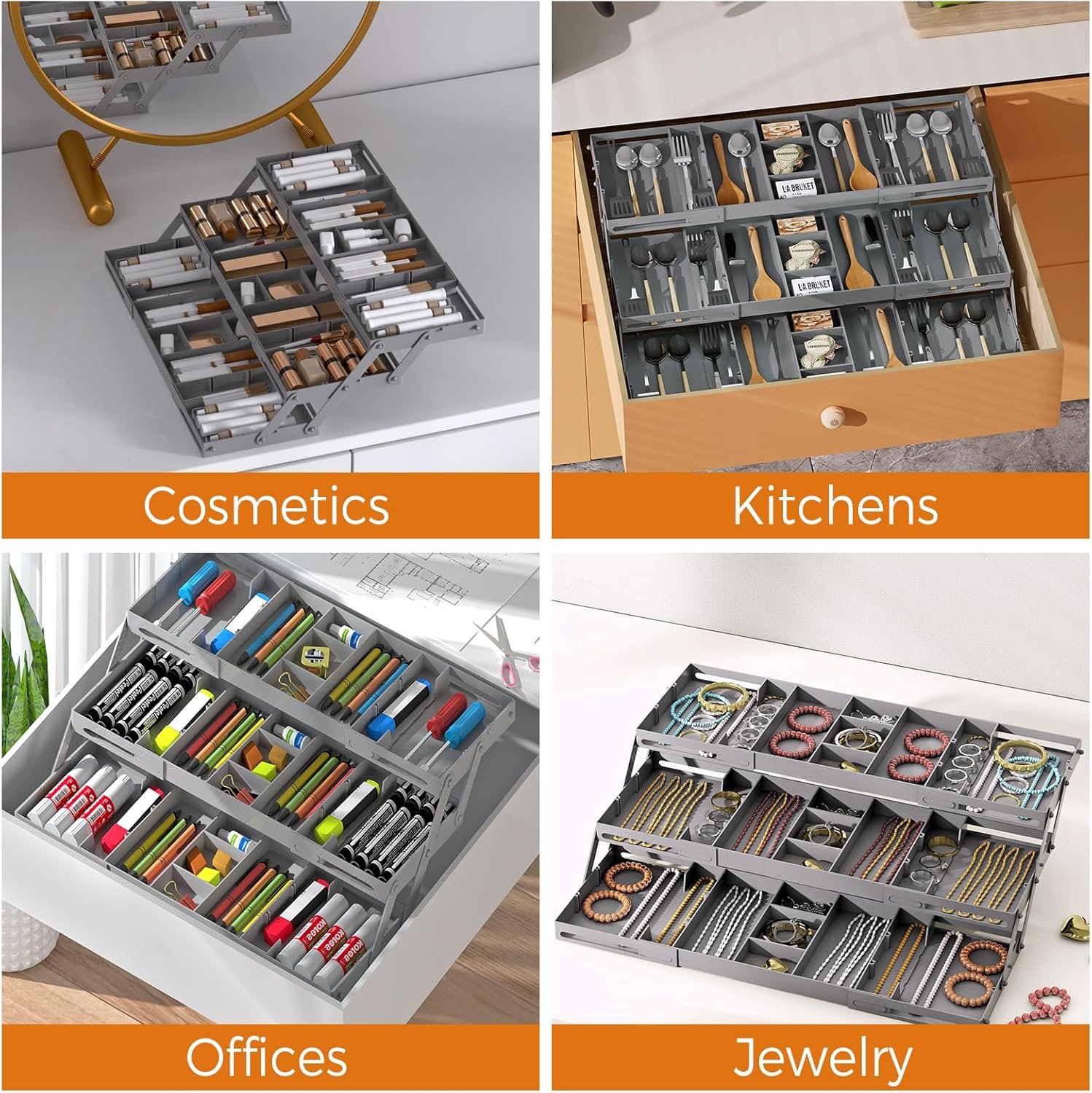 3 Tiers Drawer Organizer – Maximize drawer storage space! our junk drawer organizer is designed with 3-level storage, which can eliminate clutter and free up more storage space, fit for drawers, bedrooms, vanity, tabletops, countertops, office, kitchen, etc.