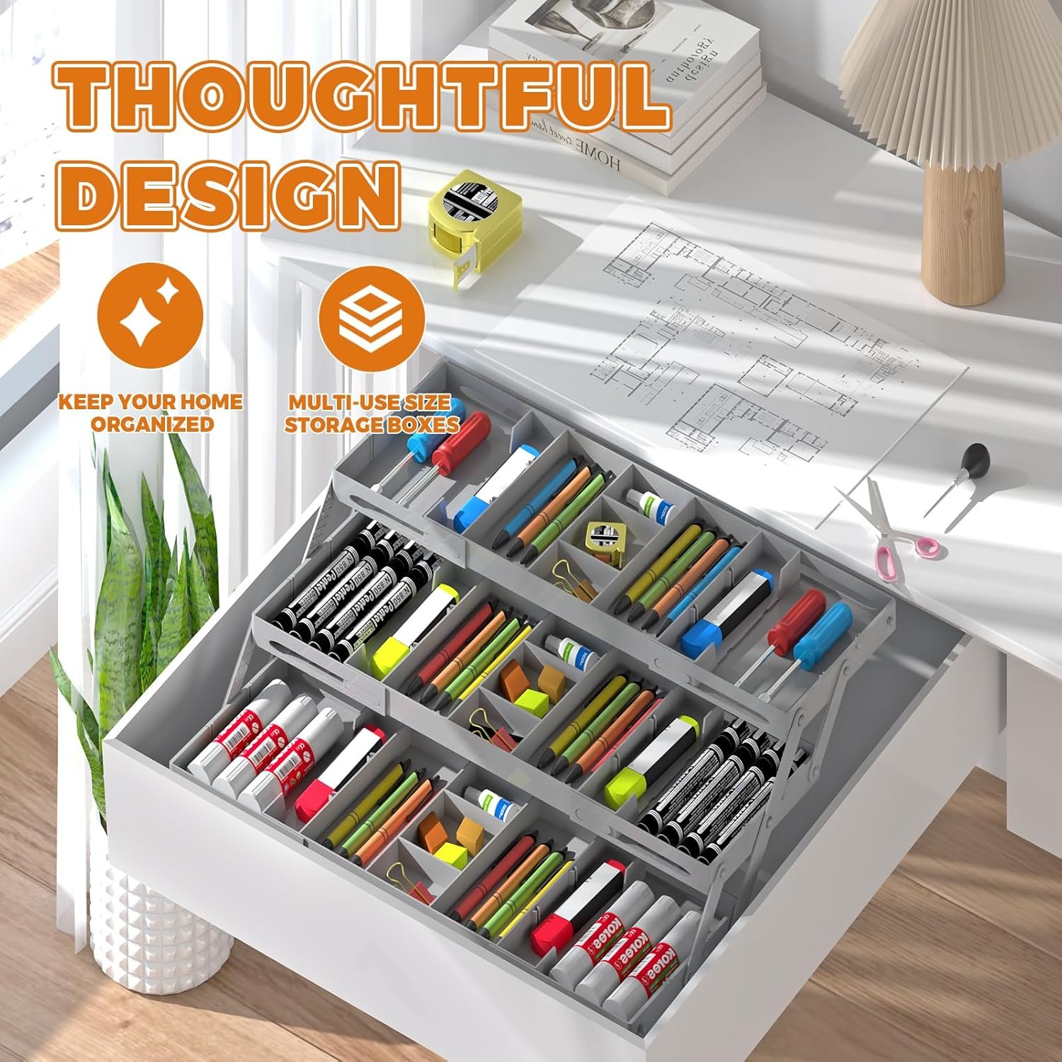 Expandable Drawer Organizer for Small Item – Our office drawer storage adopts a collapsible and expandable design to ensure a wide range of applications and uses adjustable dividers to easily alter compartment sizes. Fits for office drawers such as pens, adhesive tape, clips, etc., kitchen small tools such as spoons, forks, coffee capsules, etc., messy vanities such as lipstick, eyebrow pencil, jewelry, etc., and untidy countertops. Experience true efficiency and tidiness in life! (Warm Tip: Item is suitable for small items. Please confirm the type of items you wish to store beforehand.)