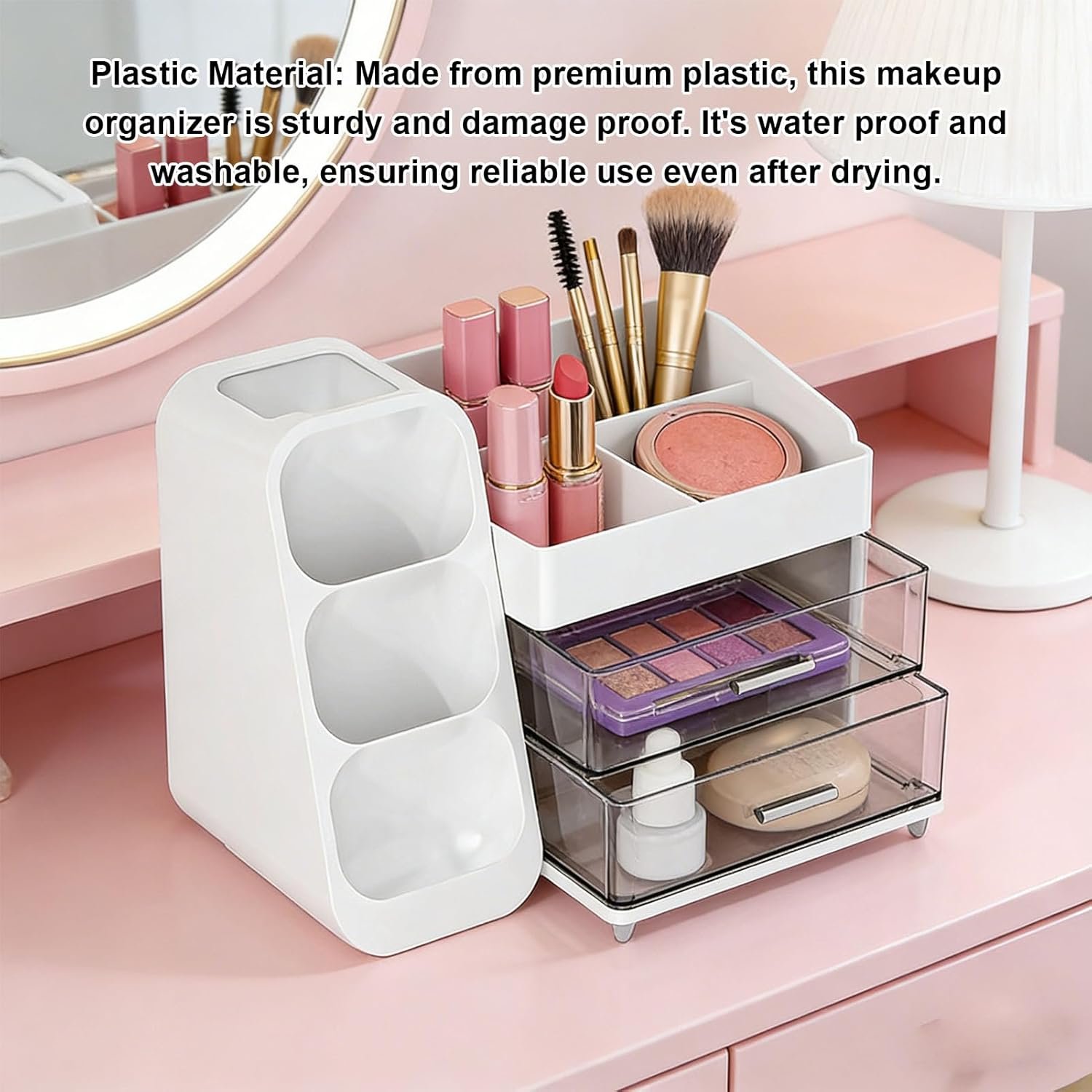 Plastic Material: Made from premium plastic, this makeup organizer is sturdy and damage proof. It’s water proof and washable, ensuring reliable use even after drying.