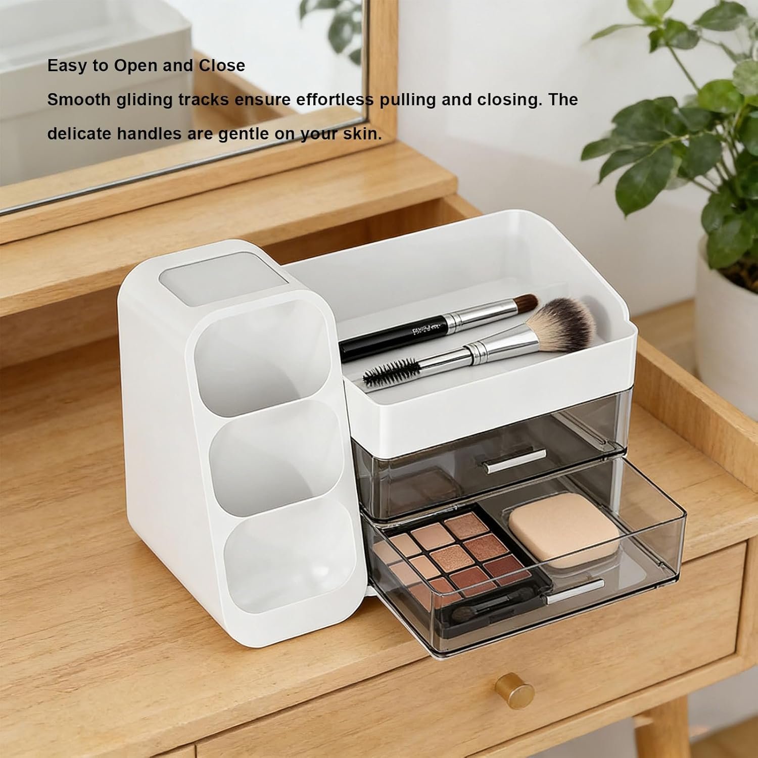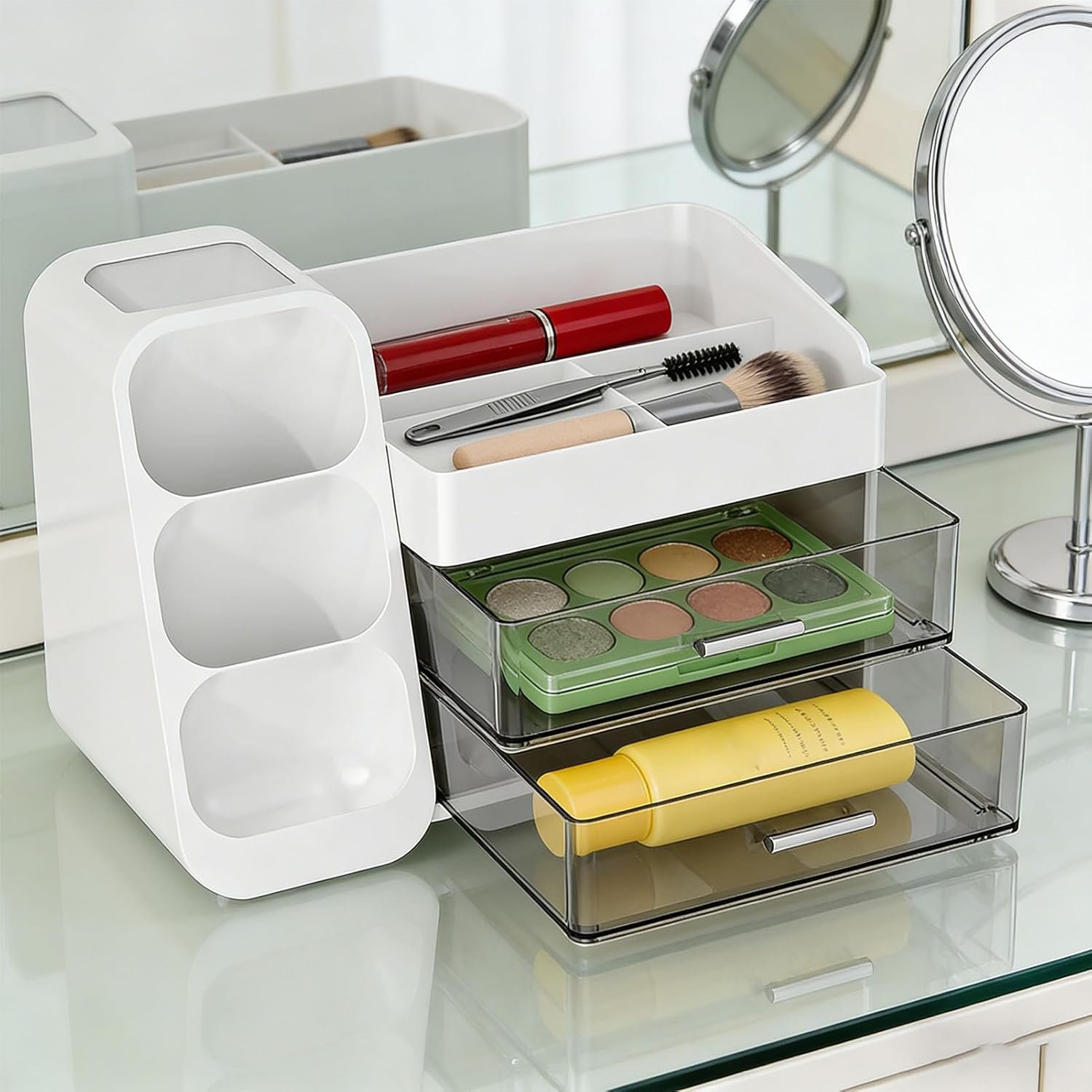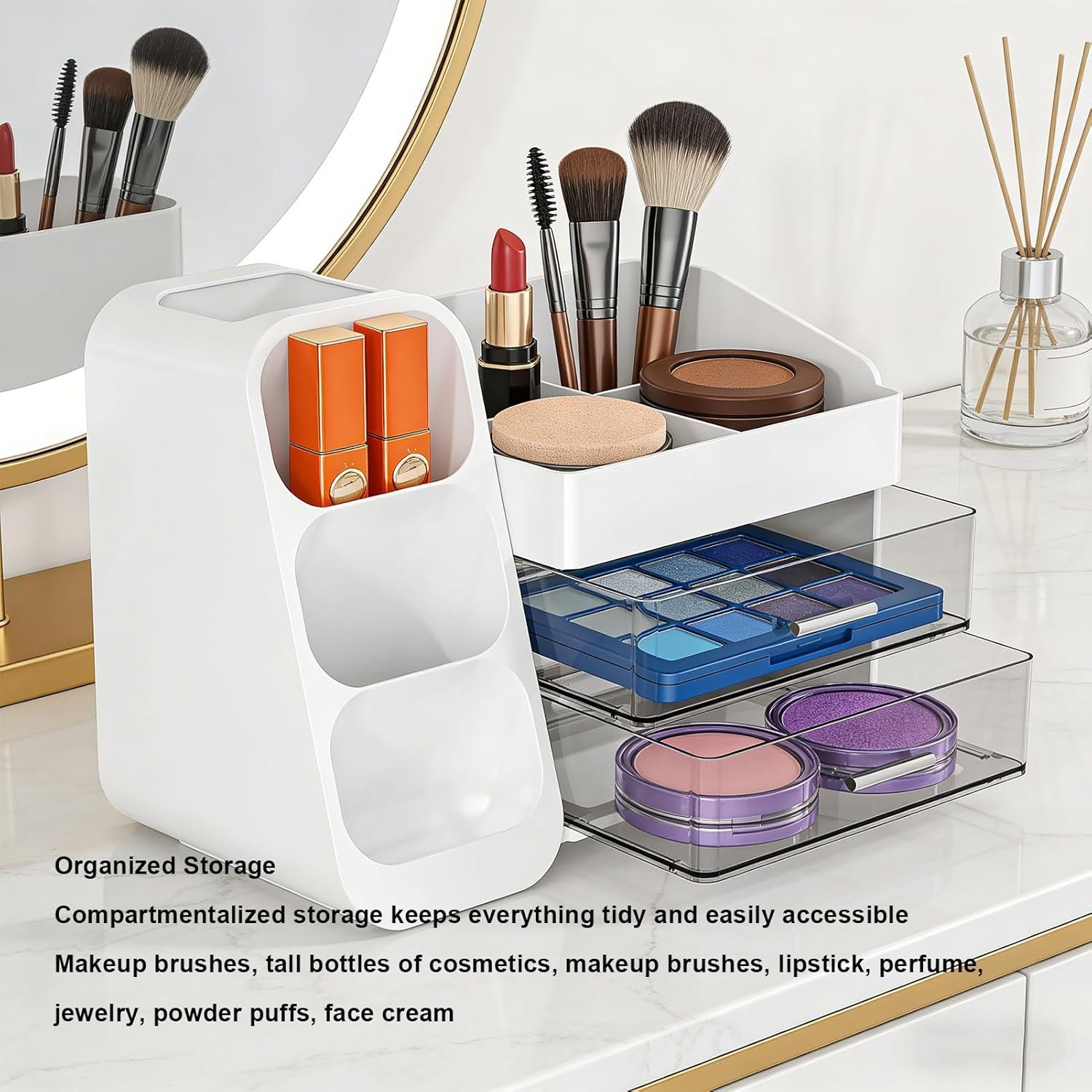 Spacious Storage Capacity: Features ample space to hold moisturizers, lotions, lipsticks, nail polish, makeup brushes, eyeliners, eyeshadow palettes, and other daily small items.