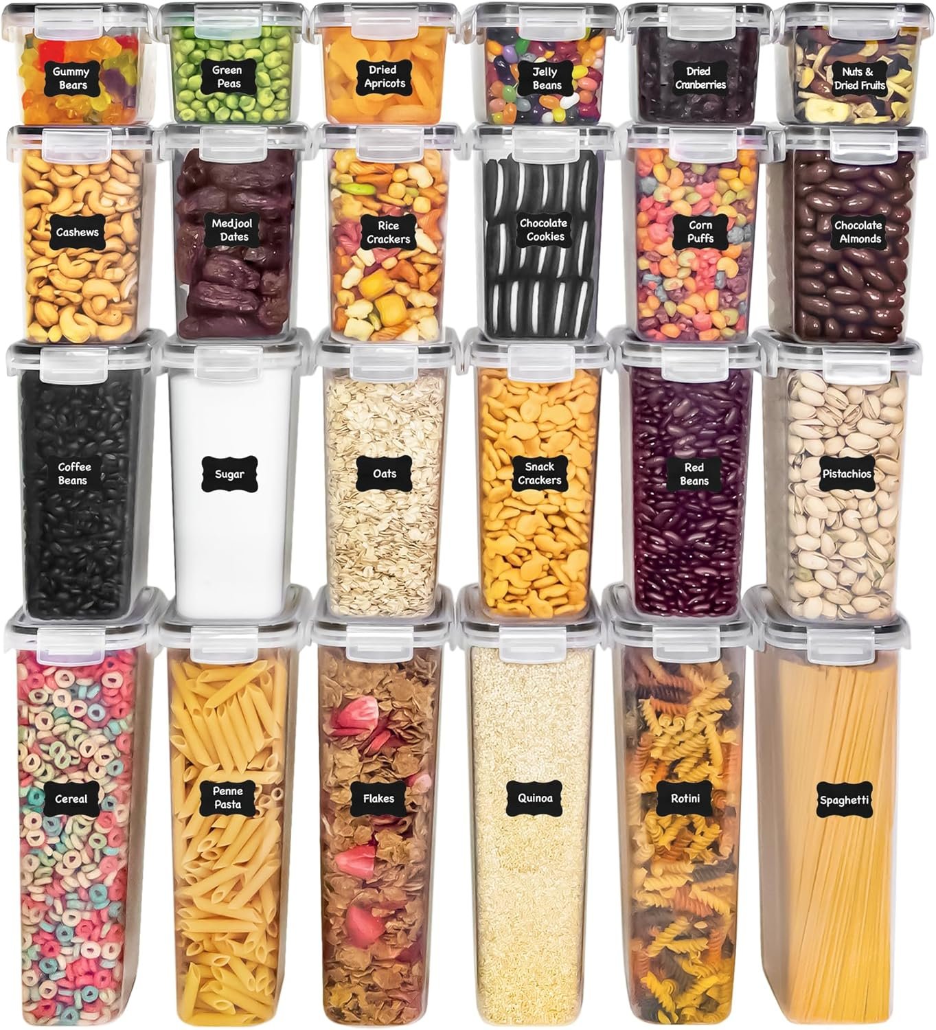 Multiple Size – Kitchen storage container set comes in 4 different sizes, from large to small, 6 Tall Containers (2.96qt /2.8L), 4 Large Containers (2.11qt /2.0L), 6 Medium Containers (1.69qt/1.6L), 6 Standard containers (0.85qt /0.8L), Perfect for storing baking supplies, cookies, cereal, sugar, oats, coffee beans, tea, nuts, spaghetti, pet food and more.
