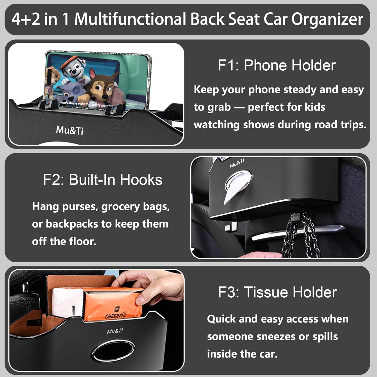 4-in-1 Functionality, Convenient Use: This seat organizer features multiple storage options, including 2 cup holders, cell phone stand, a tissue box, and several hooks. It neatly stores water bottles, snacks, toys, wipes, tissue, umbrellas, and more, making your items easy to access.