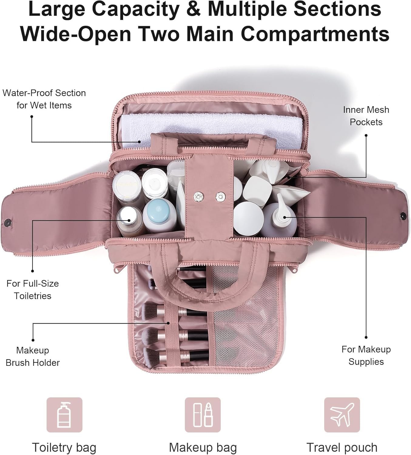 WET AND DRY SEPARATION: This large toiletry bag includes 2 waterproof compartments(front back pockets), made from durable PVC. These sections are perfect for storing damp items such as toothbrushes, wet towels or used makeup brushes – keeping them completely separate from dry toiletries and clean cosmetics. No more worries about leaks or soggy messes while traveling. The smart separation design also easy to clean: just wipe the interior, and your travel cosmetic bag stays fresh trip after trip