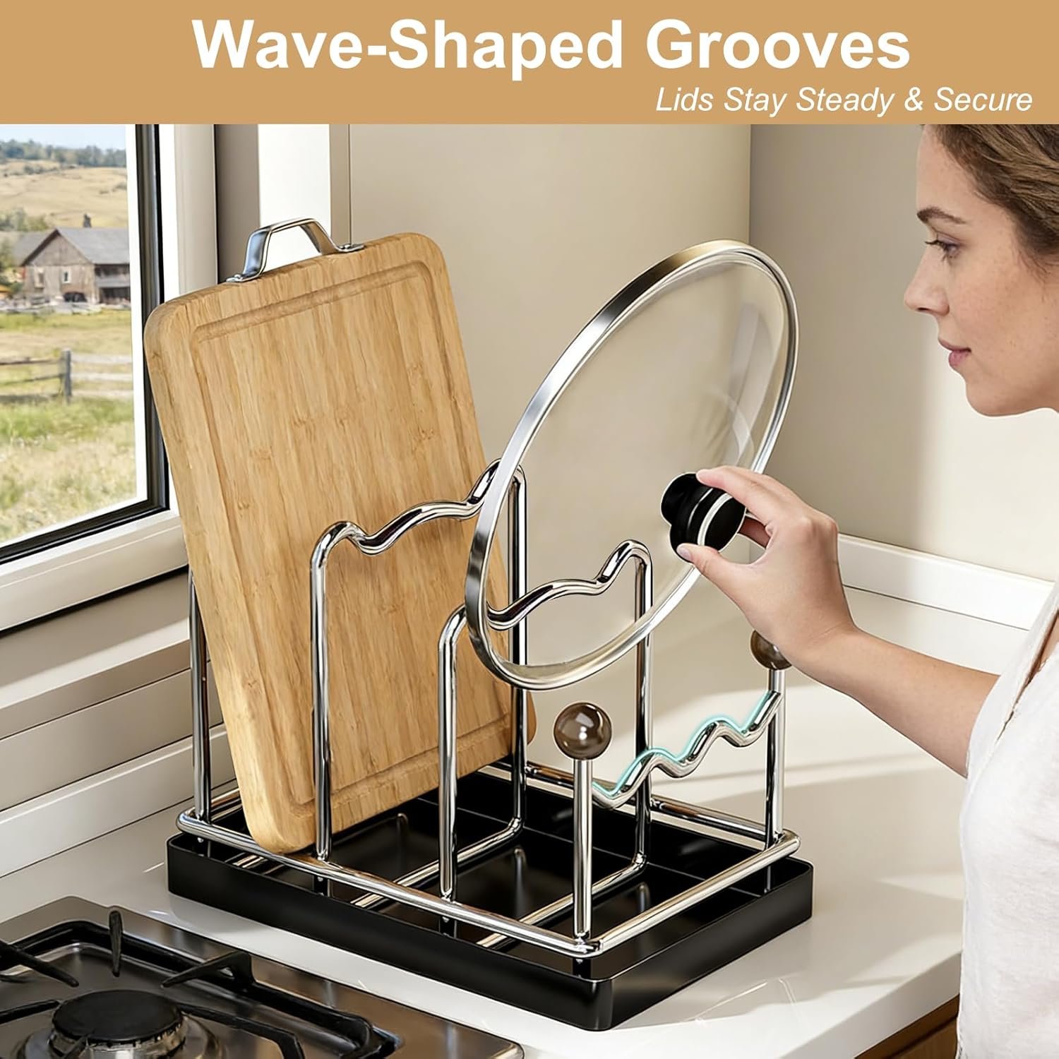 Innovative Wave-Shaped Slots Design: Unique contoured slots securely hold various sizes of pot lids and prevent wobbling, keeping your kitchenware stable and organized