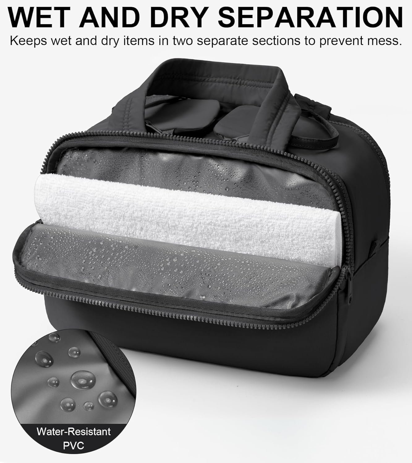 WET AND DRY SEPARATION: This large toiletry bag includes 2 waterproof compartments(front back pockets), made from durable PVC. These sections are perfect for storing damp items such as toothbrushes, wet towels or used makeup brushes – keeping them completely separate from dry toiletries and clean cosmetics. No more worries about leaks or soggy messes while traveling. The smart separation design also easy to clean: just wipe the interior, and your travel cosmetic bag stays fresh trip after trip