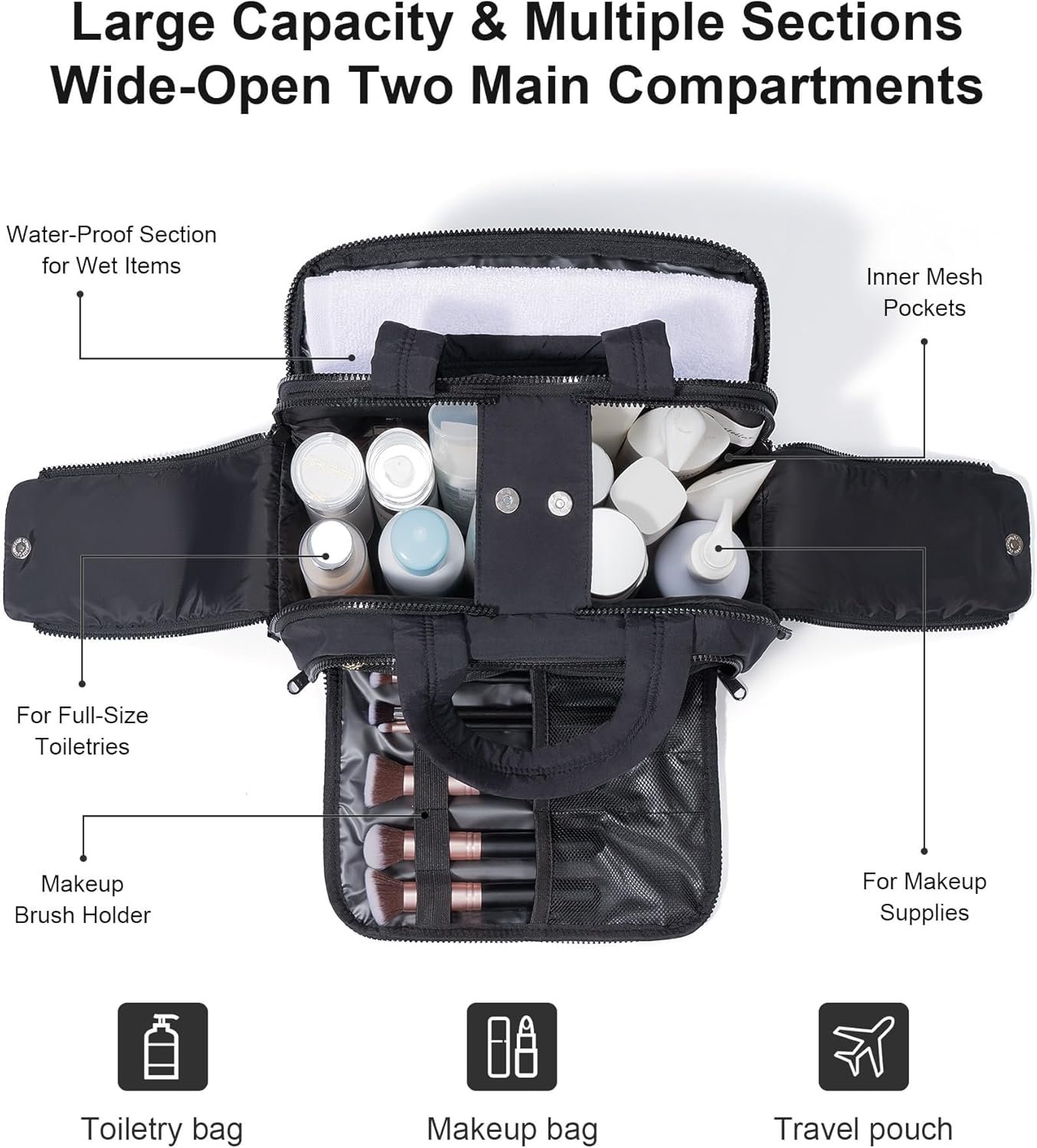 LARGE CAPACITY MAKEUP BAG: With dimensions of 11”L x 6”W x 8”H, this large cosmetic case organizer for toiletries offers ample storage through two functional main compartments. Front pocket for brushes & makeup, back pocket is waterproof section. Additional features like mesh pockets, elastic brush loops, and wide-access front and side pockets allow easy organization and quick retrieval of makeup, toiletries, travel-sized items and travel accessories – ideal for short trips or longer vacations