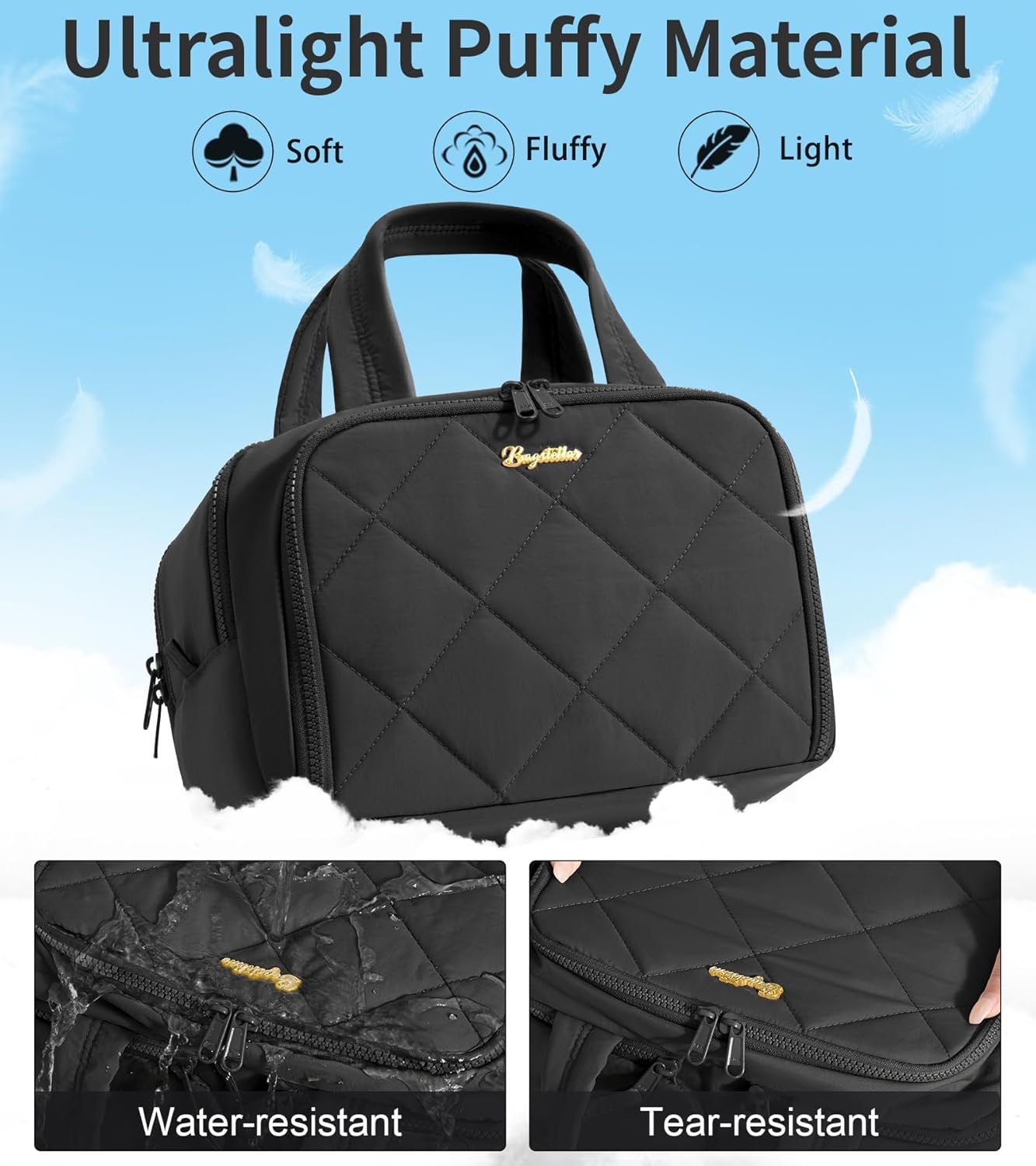 SOFT & WATERPROOF PUFFER TRAVEL TOILETRY BAG: Crafted from high-quality polyester with a cloud-like softness and an elegant diamond-stitch pattern, our custom makeup bag offers both style and durability. Its padded base and sides maintain structure, preventing sagging while protecting items from spills and impacts during travel. Featuring a PVC-coated exterior, this quilted makeup bag for women is waterproof and easy to clean. Bagstellar cute travel makeup bag is ideal companion for any journey