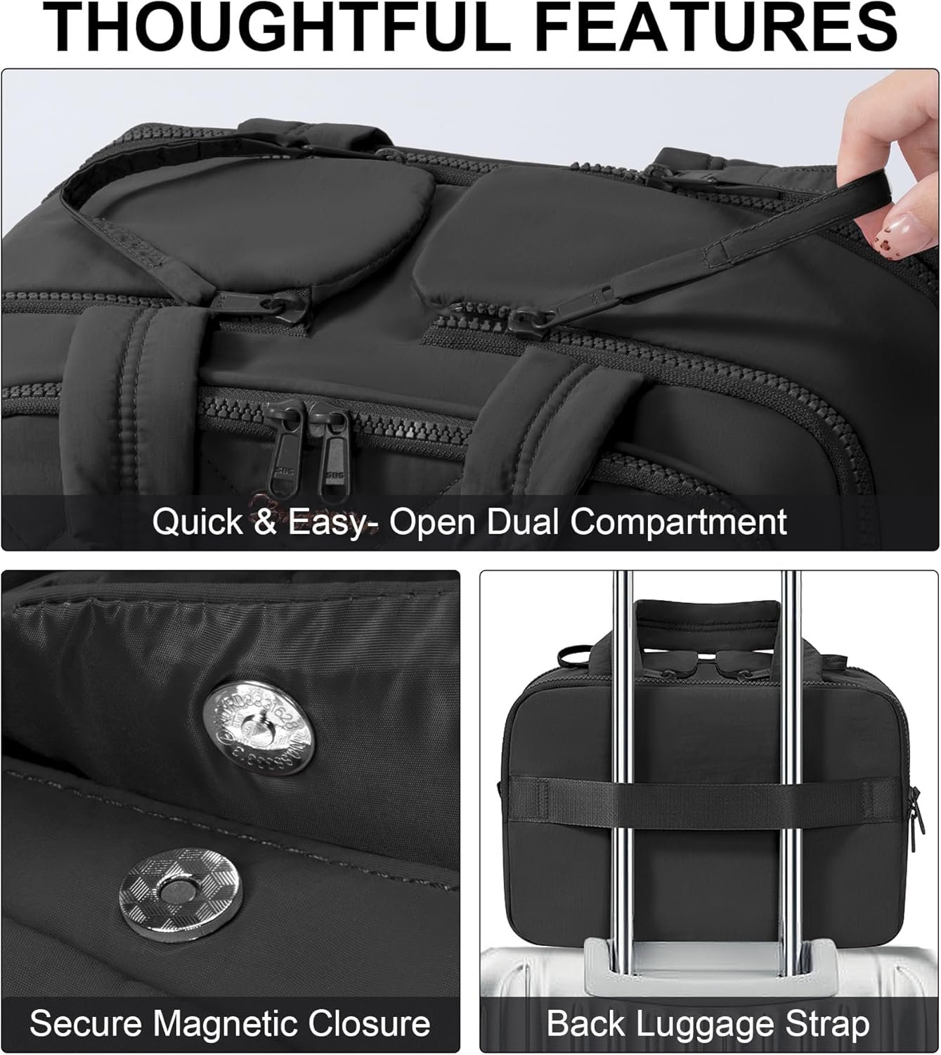 LIGHTWEIGHT & TRAVEL-FRIENDLY ORGANIZER: Ideal travel toiletries bag for women, this travel bag for toiletries includes dual side pockets with secure magnetic snaps and zipper straps for quick, safe access. A back luggage strap allows easy attachment to suitcase handles, enabling hands-free carrying. Lightweight and compact, it fits effortlessly into carry-on luggage, making it perfect as travel gift, gym toiletry bag, shower bag, skincare bag, travel packing organizers or daily essentials pouch