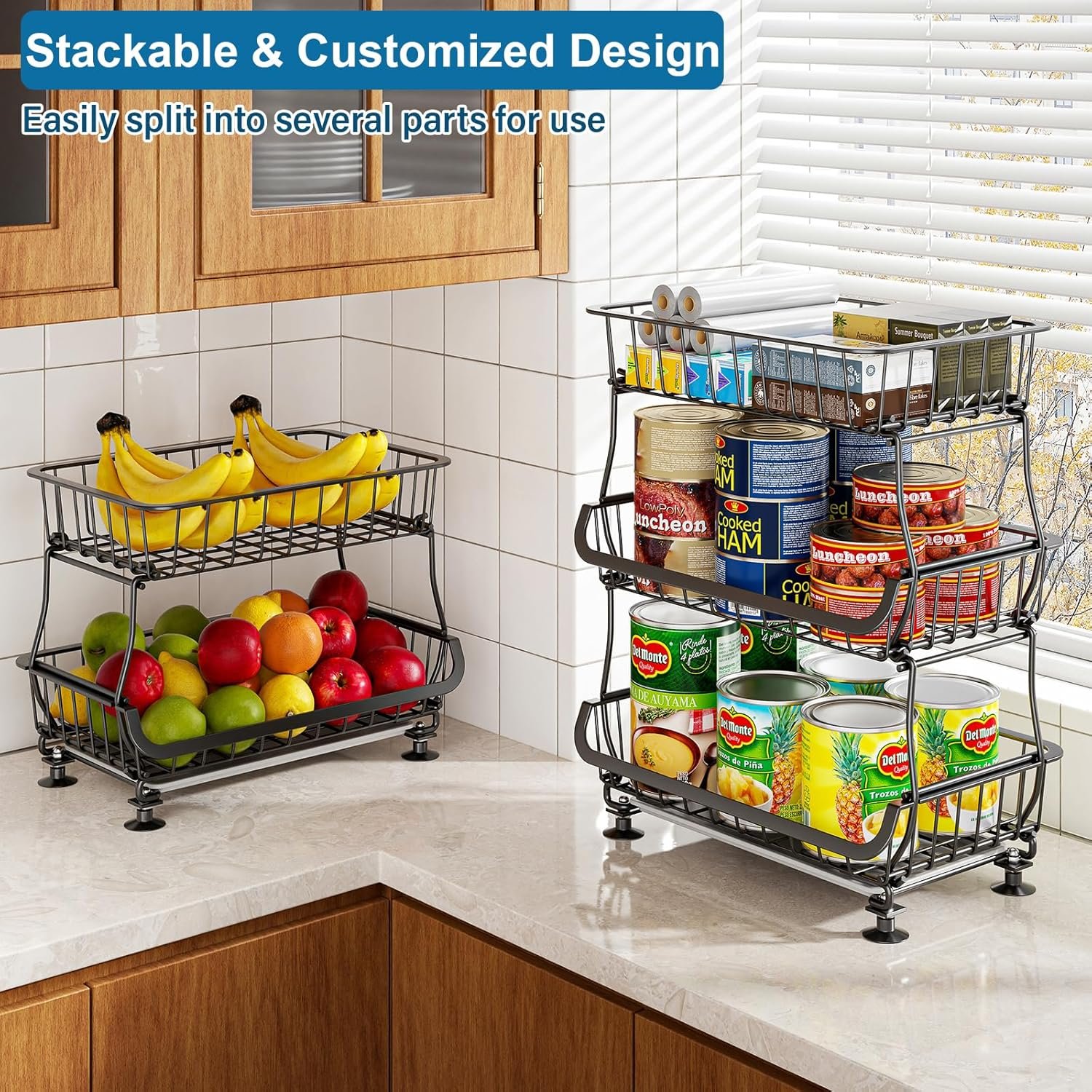 3-Tier Rolling Pantry Floor Organizer and Storage Cart with Wheels, Stackable Wire Pantry Baskets for Pantry Shelves, Kitchen Fruit Basket Stand and Storage Rack for Fruit Snack Onion Potato