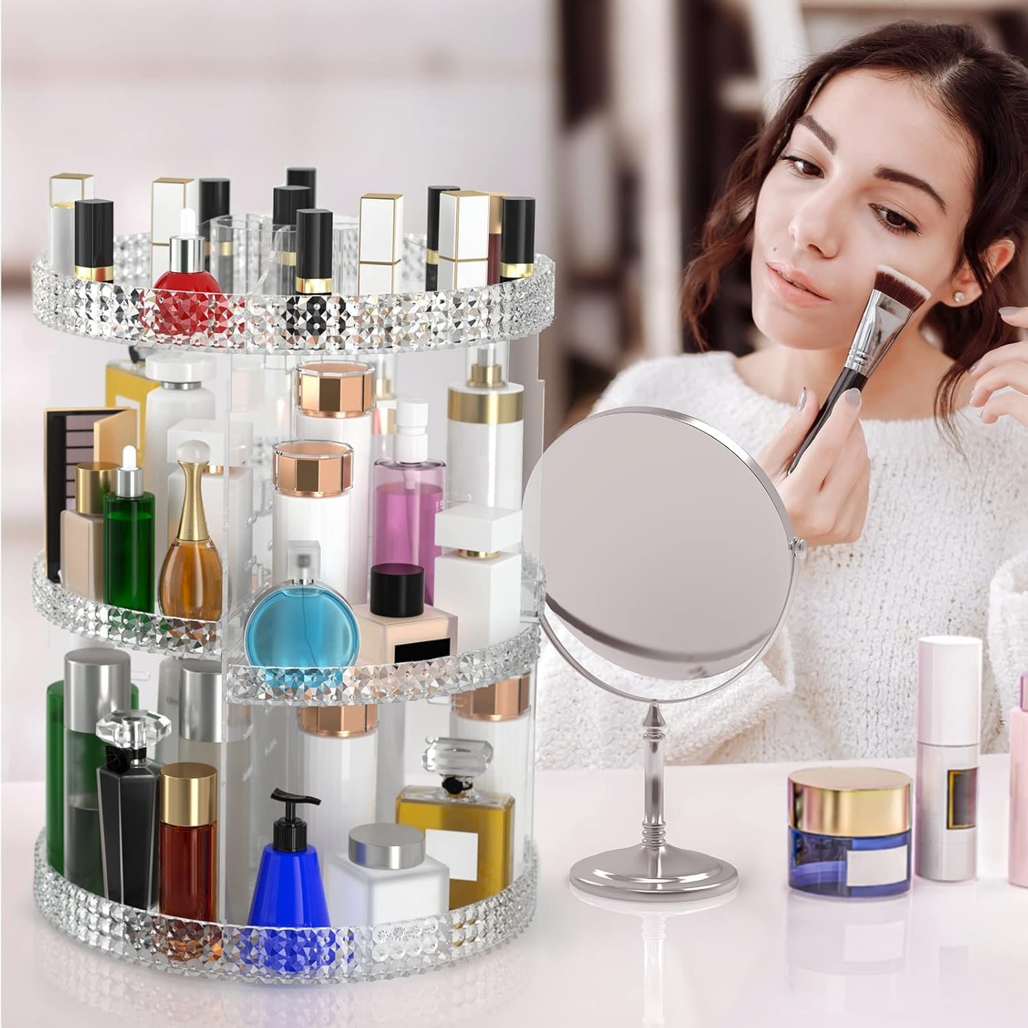 ✅【➌❻⓿ 𝐃𝐞𝐠𝐫𝐞𝐞 𝐑𝐨𝐭𝐚𝐭𝐢𝐨𝐧 𝐰𝐢𝐭𝐡𝐨𝐮𝐭 𝐍𝐨𝐢𝐬𝐲 𝐚𝐧𝐝 ➐ 𝐀𝐝𝐣𝐮𝐬𝐭𝐚𝐛𝐥𝐞 𝐋𝐚𝐲𝐞𝐫𝐬】Reinforced steady base rotates smoothly and silently, easy access to all of your make-up in seconds. 7 Adjustable layers can adjust to accommodate all your cosmetics in different sizes and heights. DIY DECORATING YOUR MAKEUP TABLETOP. (360 Makeup Organizer Is An Ideal Gift For Your Wife, Your Girlfriend, Your Daughter, Or That Special Person In Your Life.)
