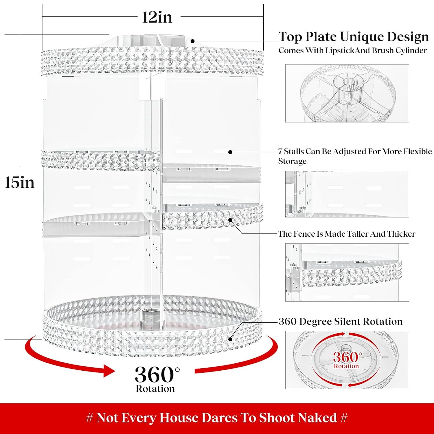 ✅【𝐋𝐚𝐫𝐠𝐞 𝐂𝐚𝐩𝐚𝐜𝐢𝐭𝐲 𝐒𝐩𝐚𝐜𝐞】The makeup organizer has been designed with a thickening process to become more durable and not easily damaged. The content of the picture shows more than 70 pcs: 30 skincare products, 20 lipsticks, 23 perfumes, 10 Eyebrow Pen, and 7 makeup brushes, saving 70% space for you. Overall Size: 11 x 11 x 15 inches.(X-Large) DEAR, WE ARE ABOUT TO RELEASE A BRAND NEW 360 MAKEUP ROTATING ORGANIZER; WITH MORE SPACE, MORE STORAGE PRODUCTS, AND COMPREHENSIVE FUNCTIONS.