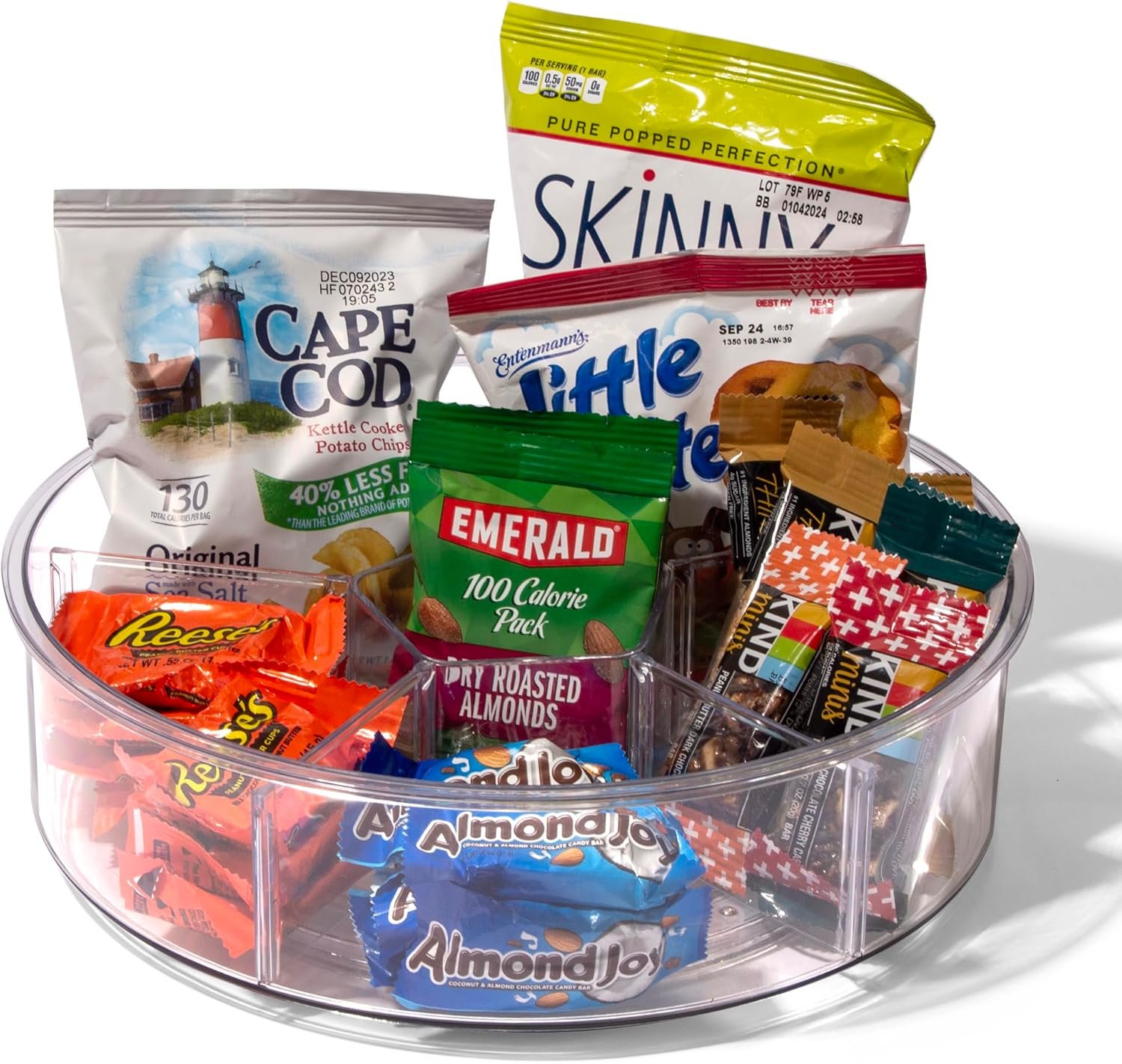 5 Removable Bins: This 11.7” round organizer features 6 removable clear bins and can be used on a turntable or taken out separately and placed in pantries, cabinets and other locations. It is an ideal way to classify and store spices, snacks, medicine, pet food, tea bags, sweeteners, coffee pods and other small items.