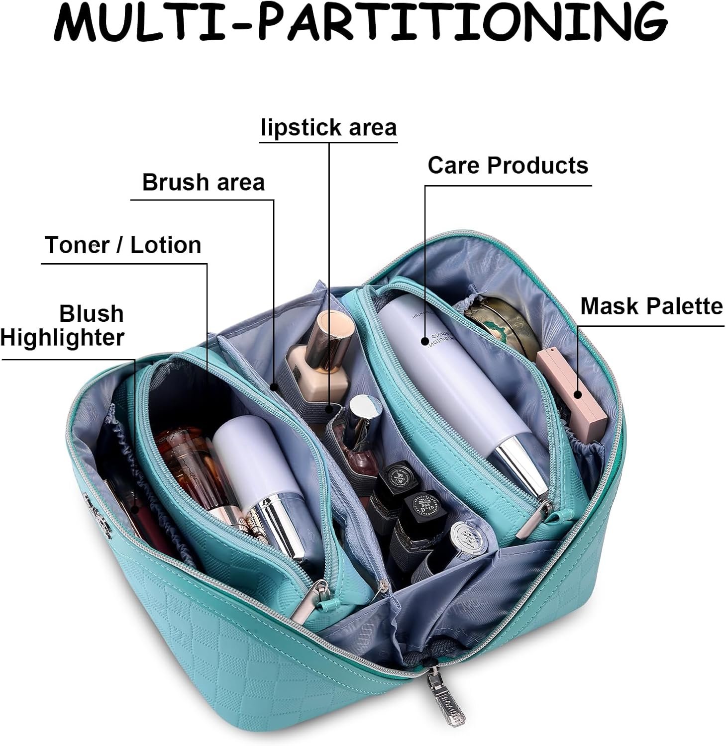 This travel makeup bag is good for 1-14 days trips or vacation. It will come with two small makeup pouches, which keep your skincare products and cosmetics organized more easily.