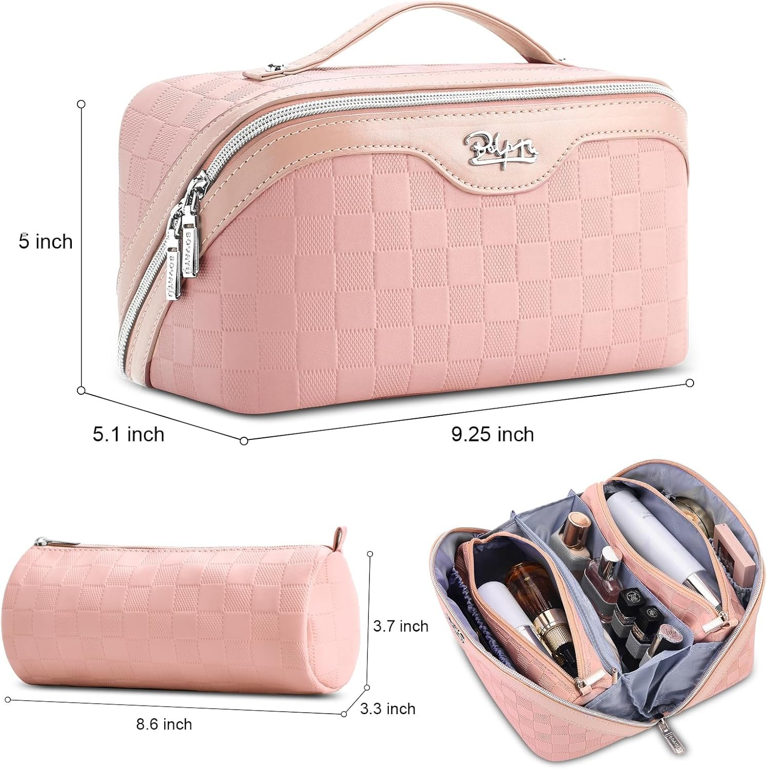 Large Capacity Travel Cosmetic Bags for Women: The size of this travel cosmetic bag is 9.25*5.1*5 inches, enough room to holds all of the lipsticks, makeup brushes, toner, lotion, blushighlighter,and mask palette for 1-5 days trips or vacation.