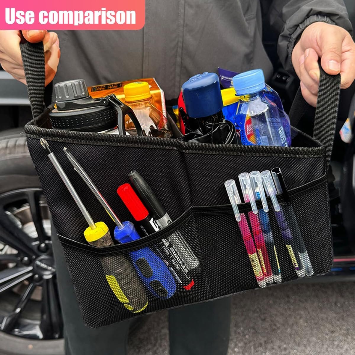 -The car trunk organizer’s mesh pocket design allows you to see the stored items at a glance, saving search time.
