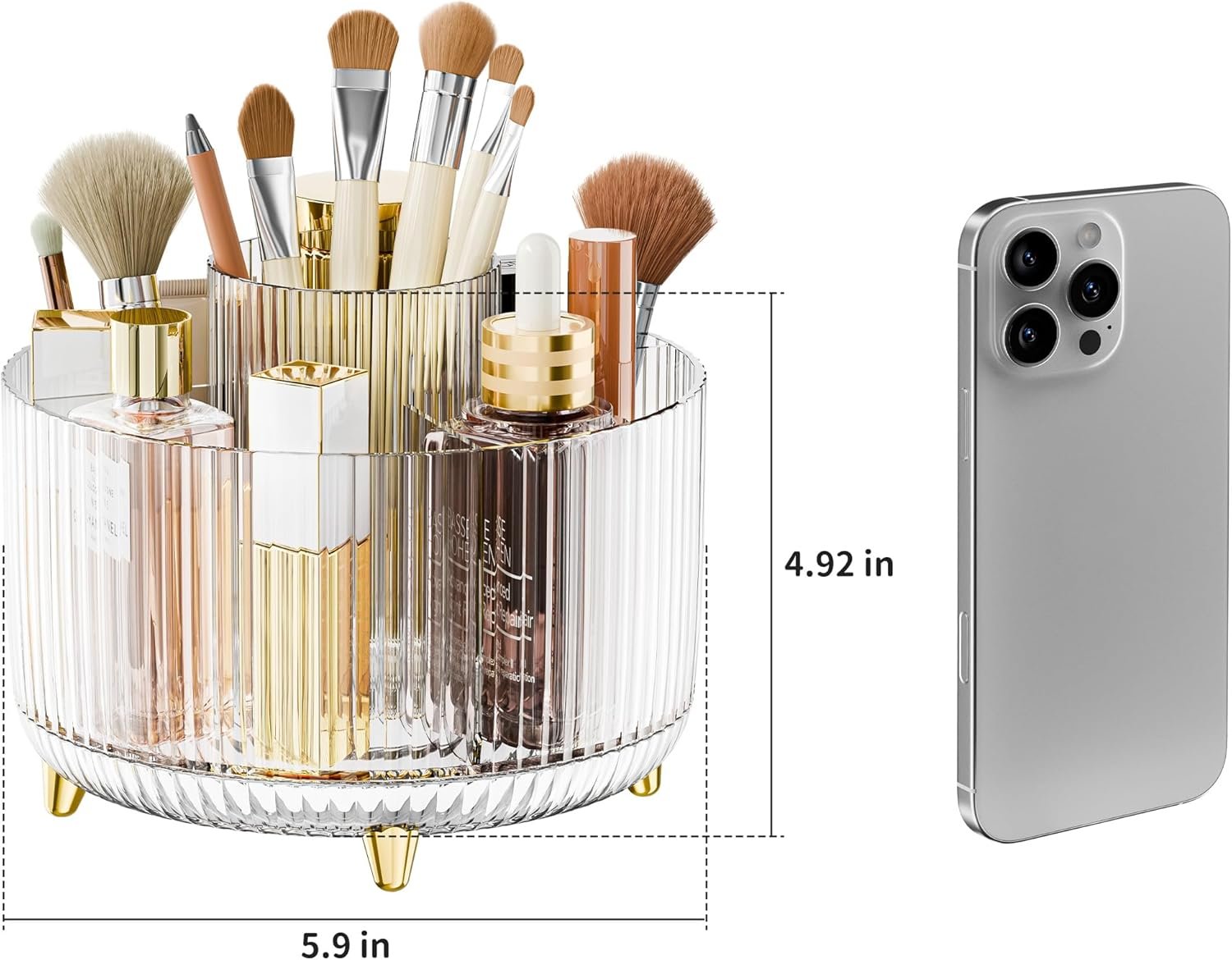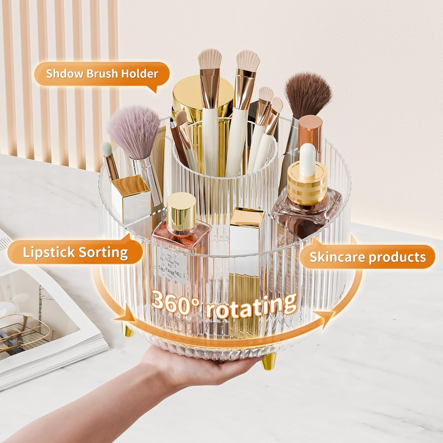 【360° Rotating Makeup Organizer】The 360° rotating base allows this makeup organizer to spin smoothly, giving you easy access to cosmetics from every direction. Simply rotate the makeup brush holder to quickly grab your brushes, lipsticks, or skincare products, making your daily routine more efficient.