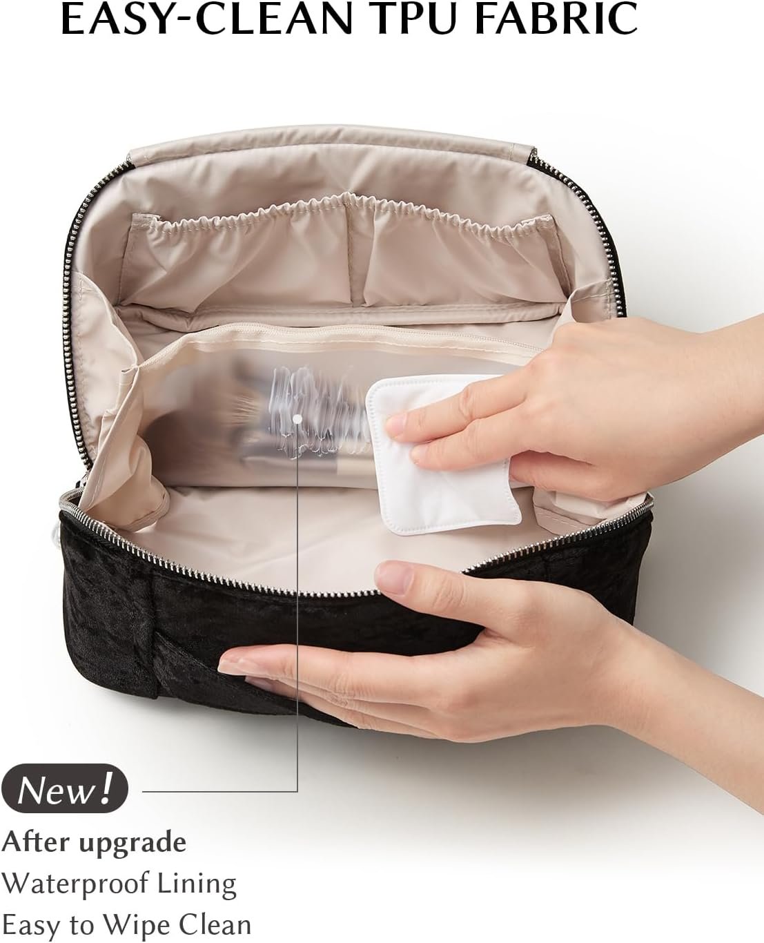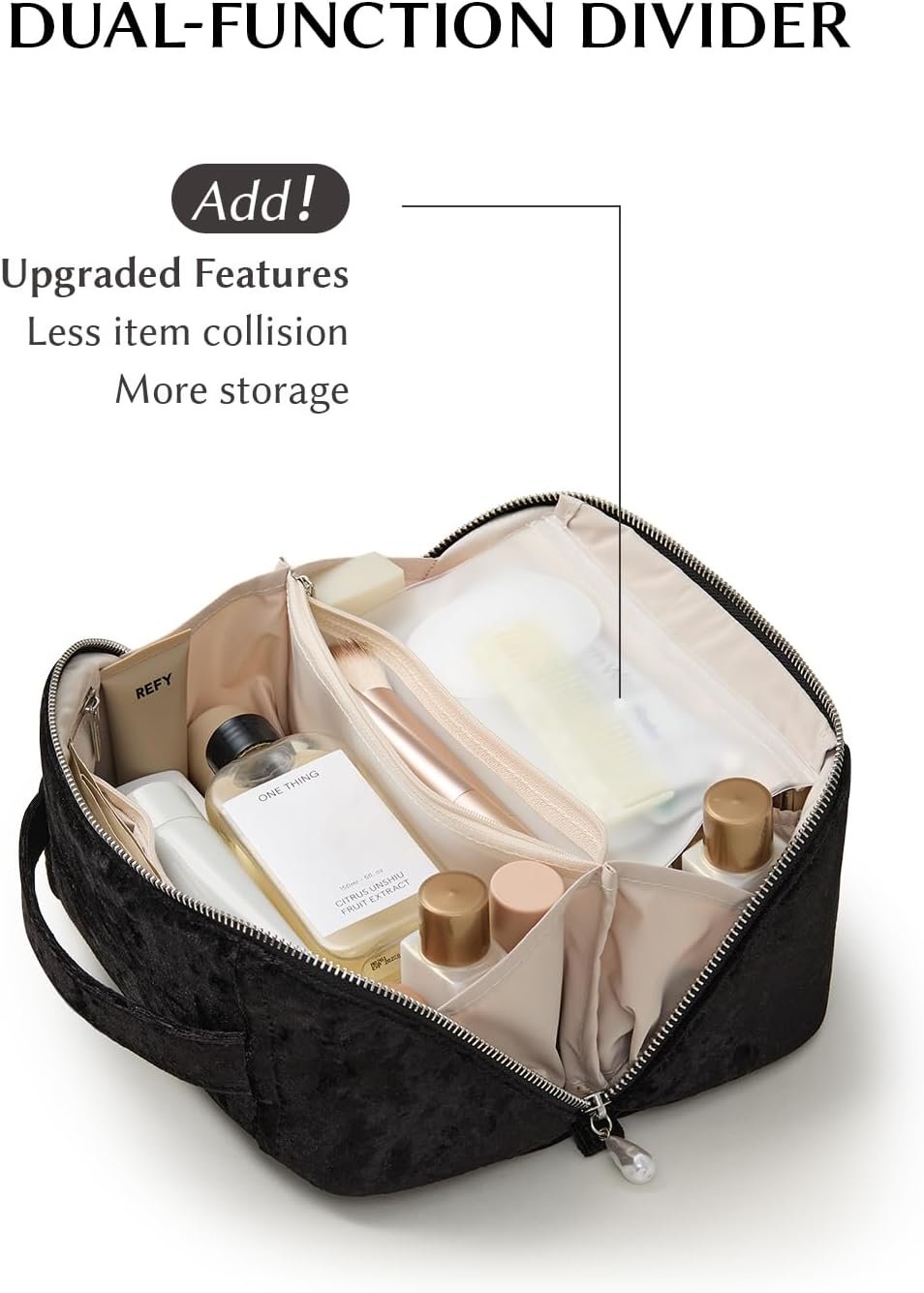 Premium Velvet Material: Crafted from luxurious velvet fabric, this makeup bag exudes timeless elegance with a soft, plush feel. The interior has a transparent TPU compartment for makeup brushes, keeping them visible, protected, and easy to clean.