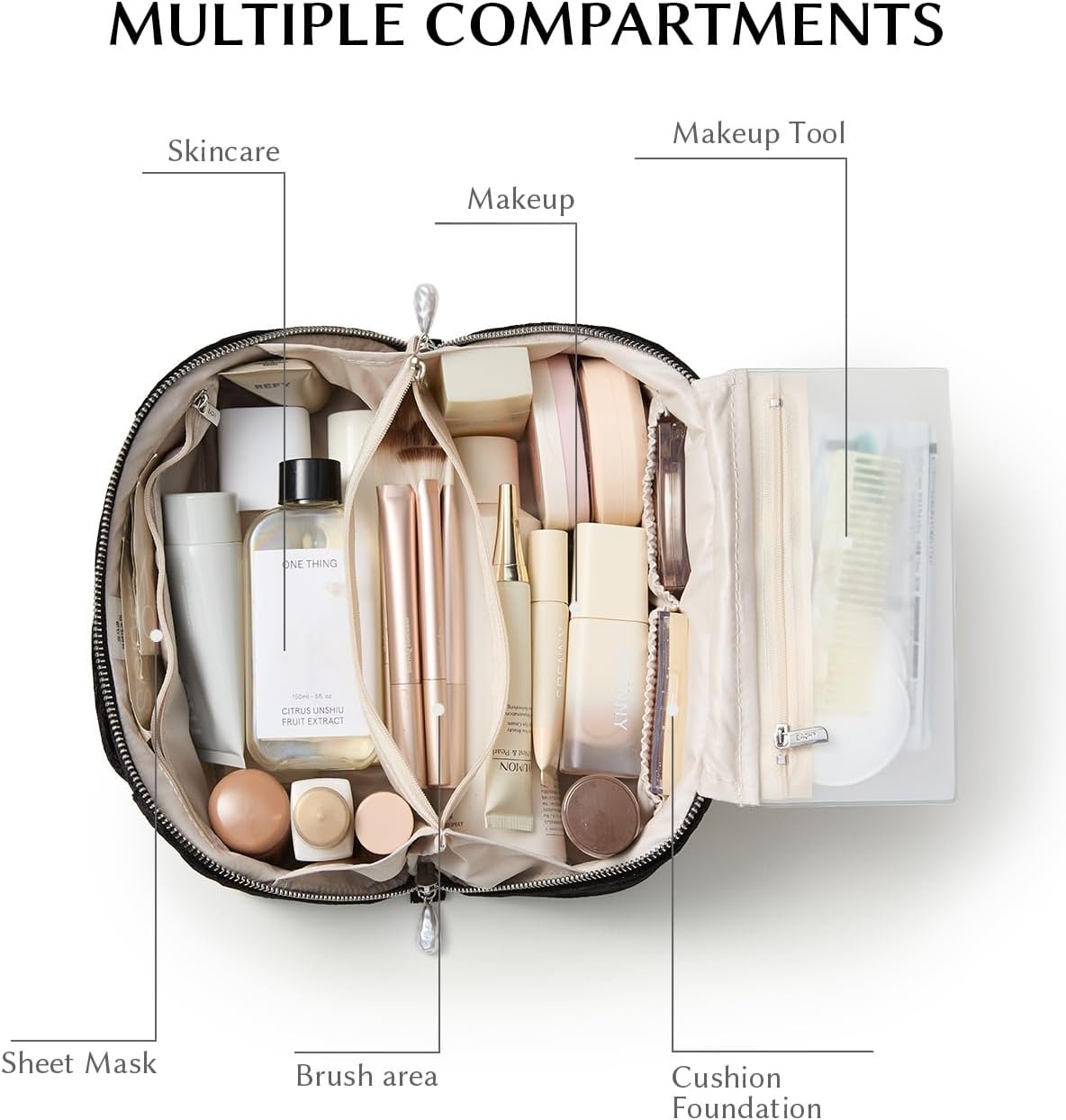 Flat-Opening Design: Designed with a dual zipper, this cosmetic bag fully opens to lay flat, offering easy access and convenient storage. The flap compartments help secure items, keeping everything organized and visible.