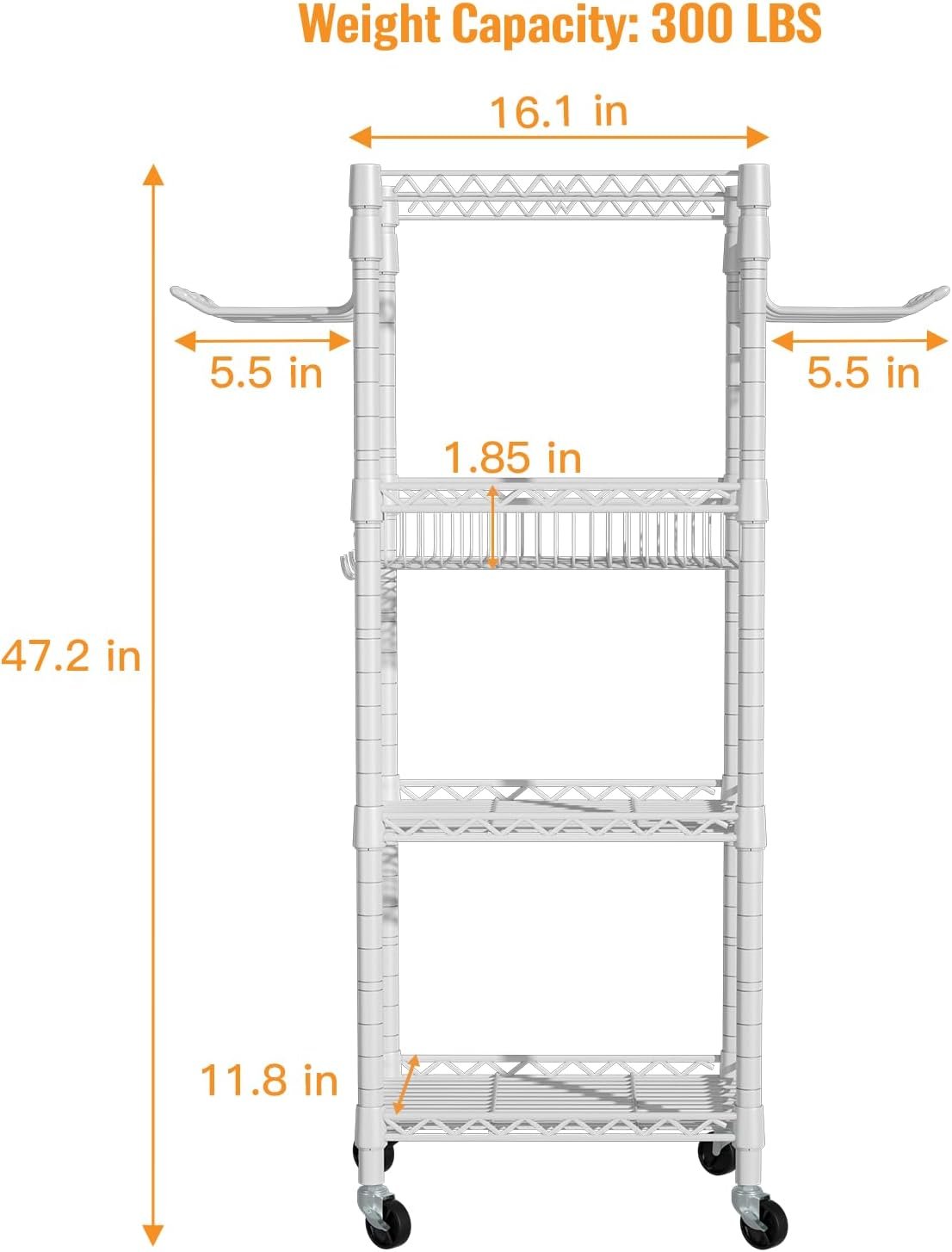Size & Weight Capacity: 36”W x 11.8”D x 32.5”H, the whole rack can hold 360 pounds. The yoga mat storage rack comes with 3 shelves, 1 wire basket, and 8 hooks, which can build an enough space for your workout equipment