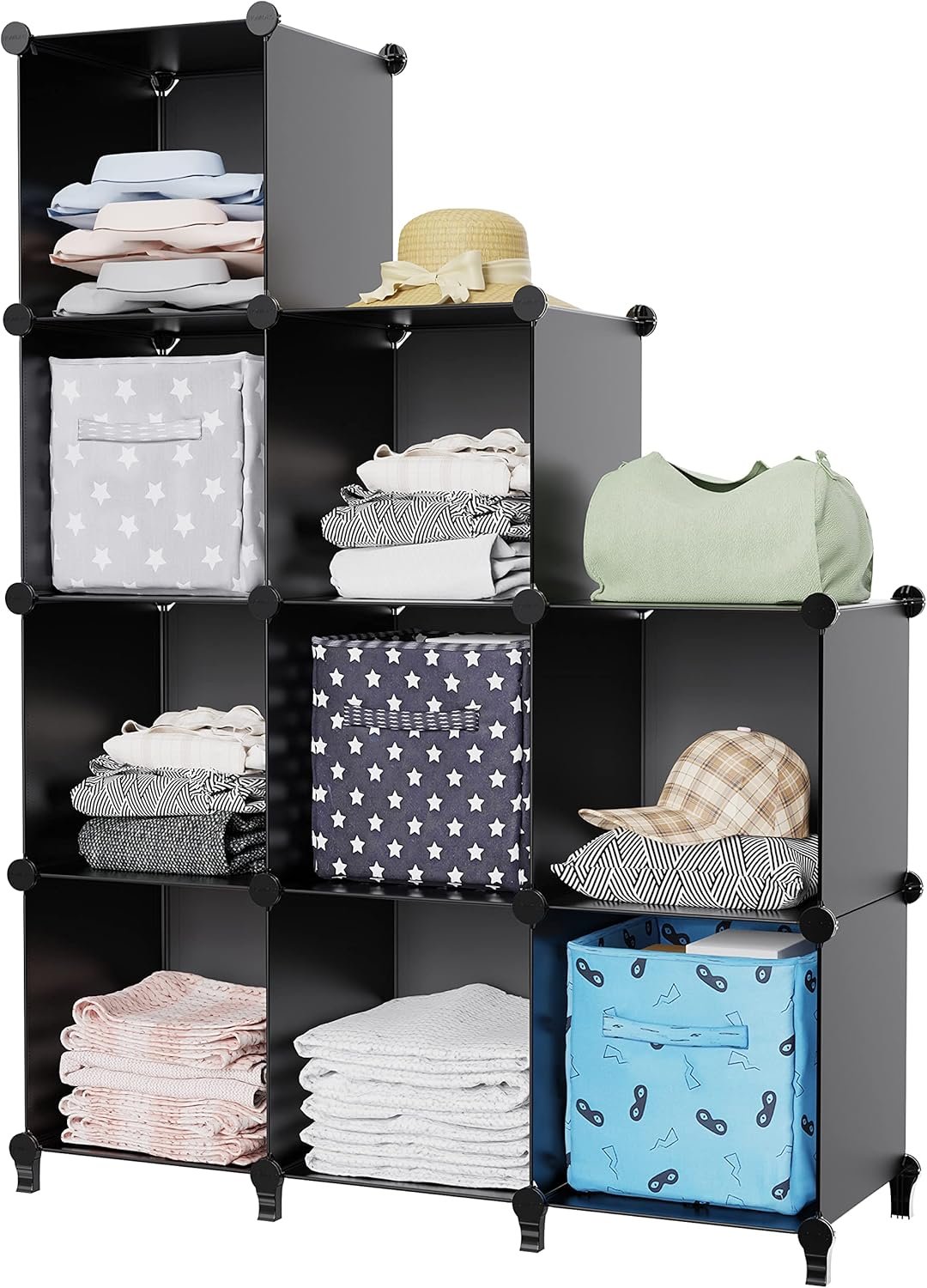 【Closet Organizer with Super stability】: Whether every sheet of the cube closet organizer get well locked decides if you can get a strong structure. Our connector is made of ABS resin, inside is multilayer lock design so it won’t easily slides out. So we suggest you lock the sheet in deepest layer to get highest stability.