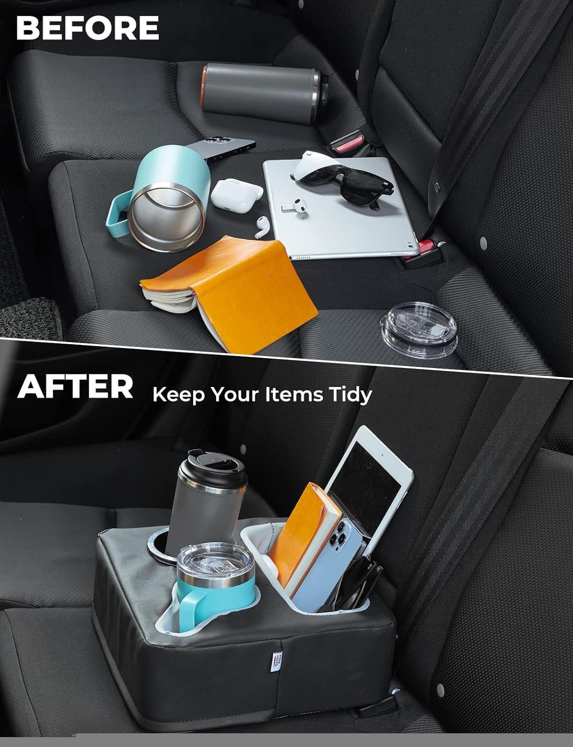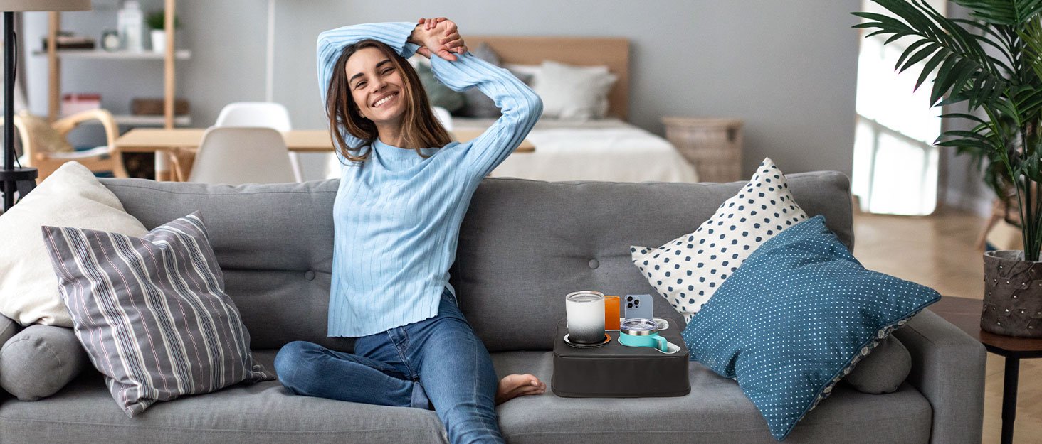 【Clutter-Free】The couch caddy with a cup holder conveniently holds drinks, food, various cups, phones, car keys, remotes, and other small items. Designed to keep your belongings organized and within easy reach, this handy accessory ensures you can quickly find the items you need while maintaining a clutter-free space.