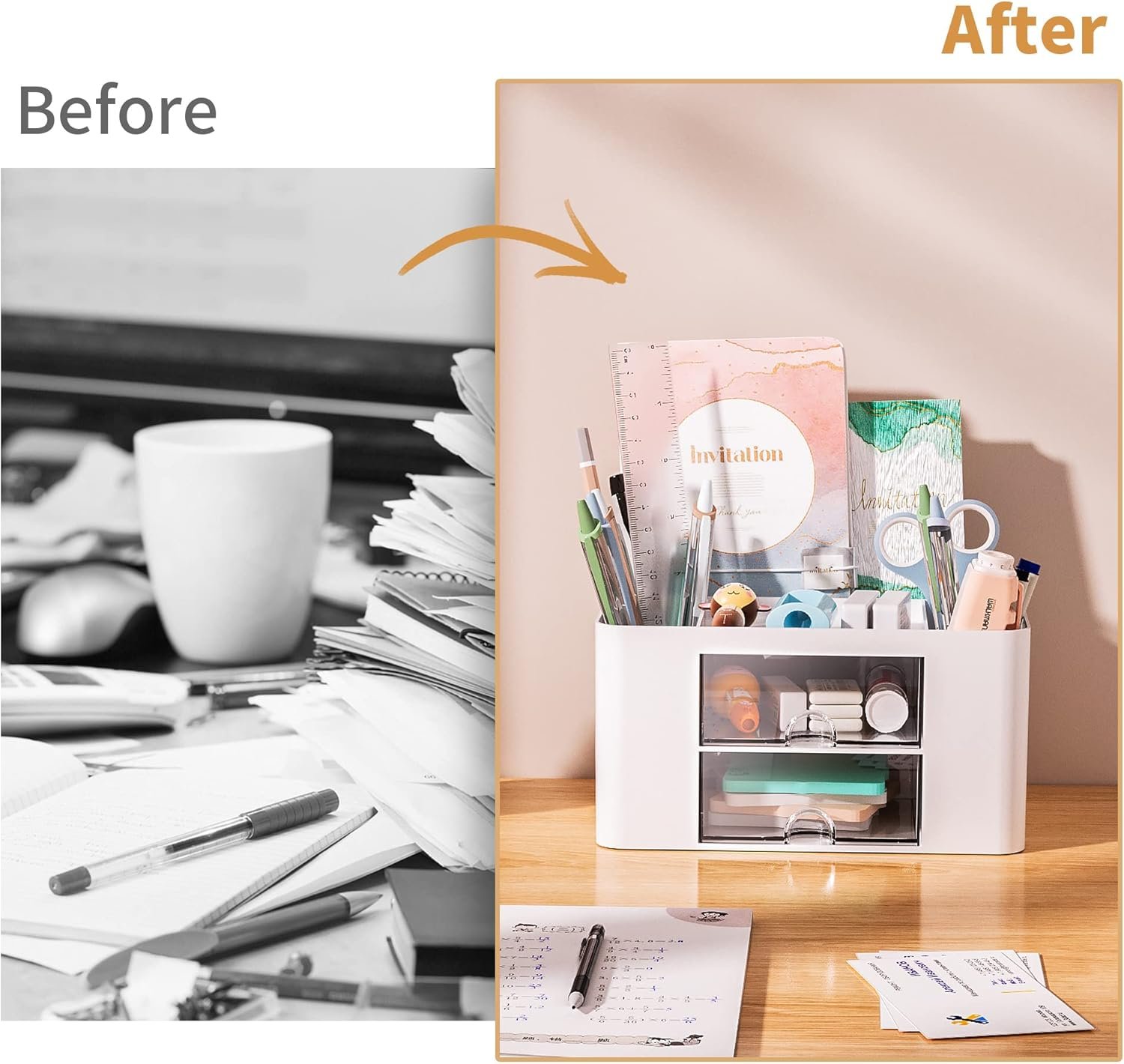 【Convenient And Multifuction】This Desk Caddy is no installation required not only perfect for storing your desktop stationery and many other desk widgets but also great for storing your makeup brushes, nail polishes, lipsticks, and other small personal items sorted by type. The transparent drawer makes it way easier to find what you need! and You can put any other daily necessities on the organizer, It helps you keep your stuff organized