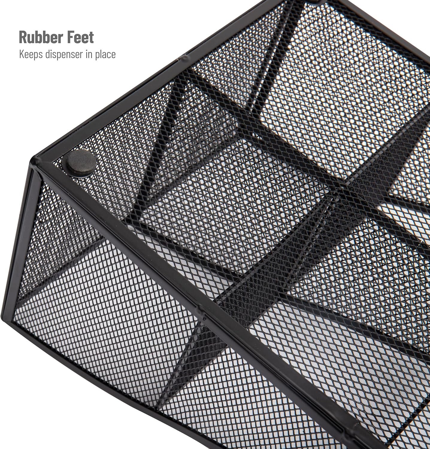 The open metal mesh construction offers durability while maintaining a clean, professional appearance that blends seamlessly into office kitchens, conference rooms, and reception areas. Non-skid feet help keep the organizer stable on countertops, tables, or inside cabinets during daily use.