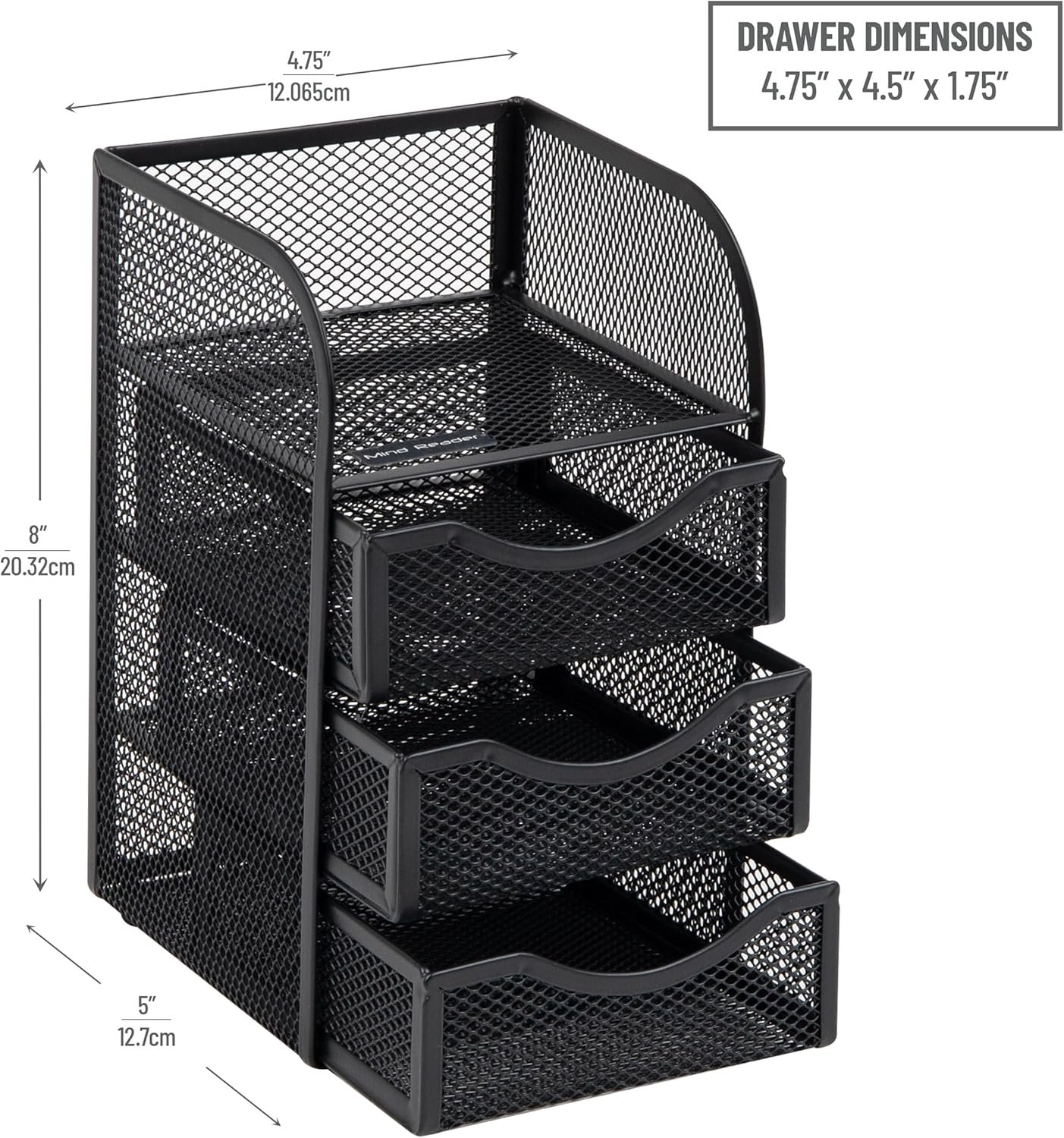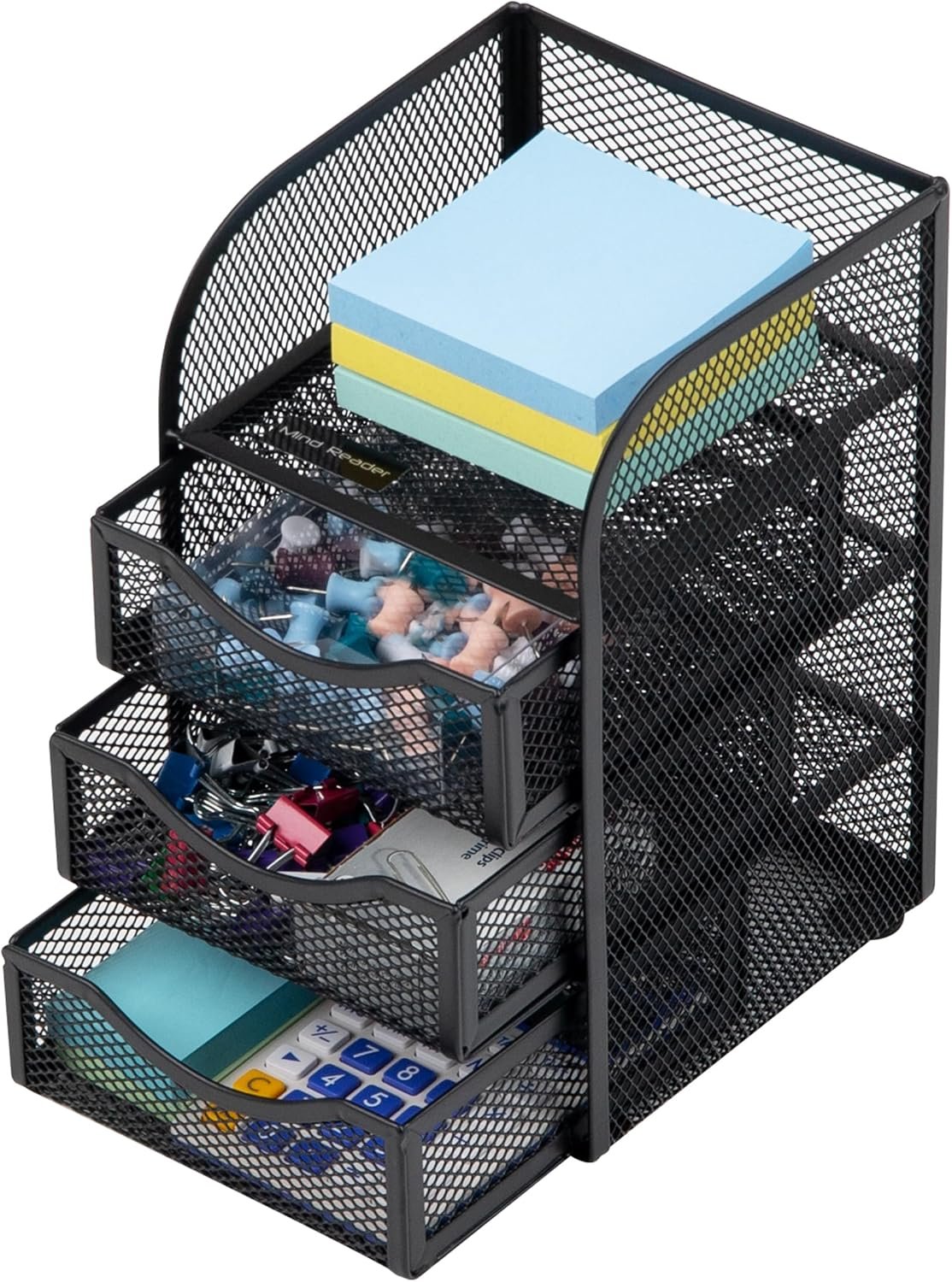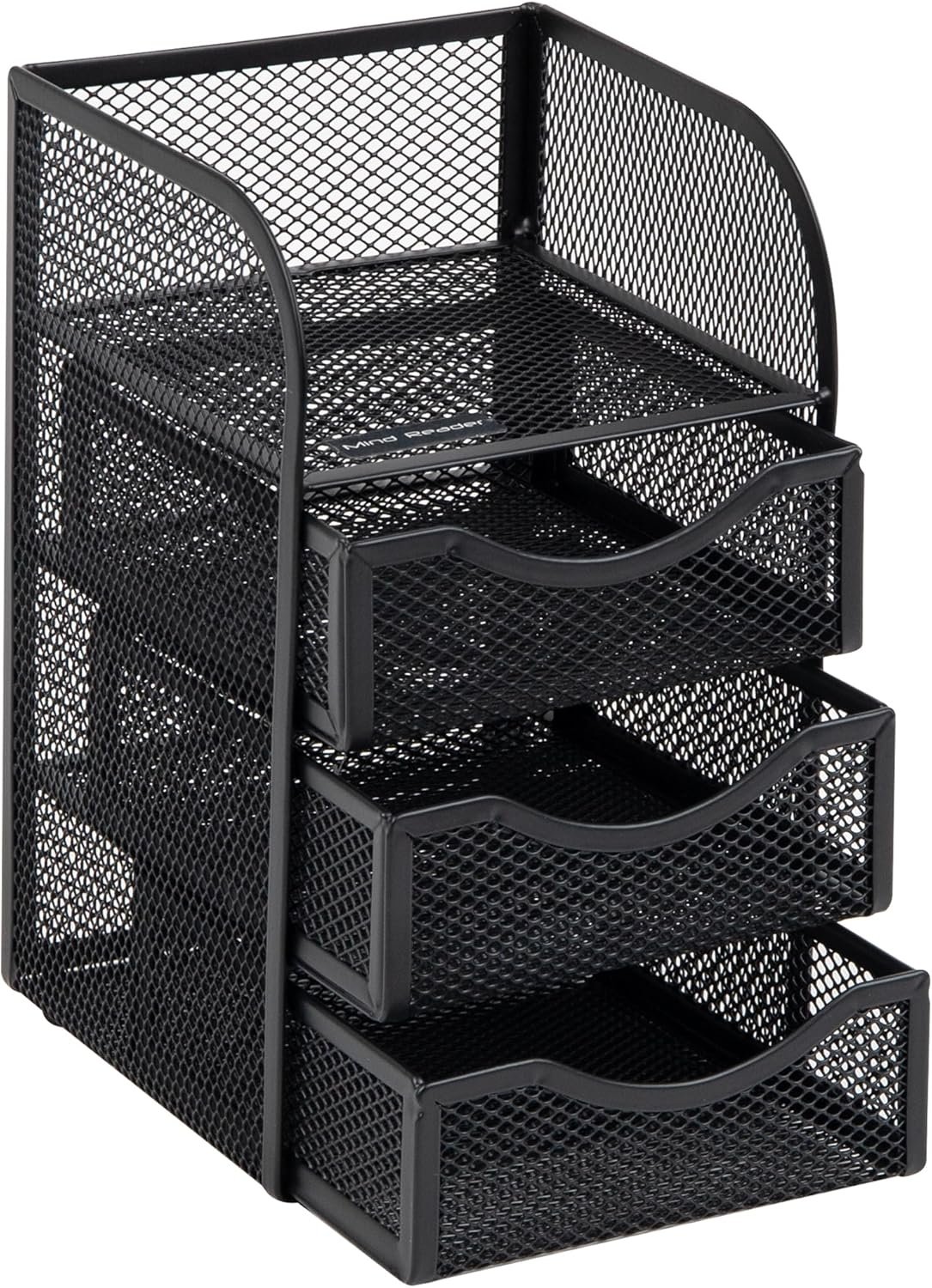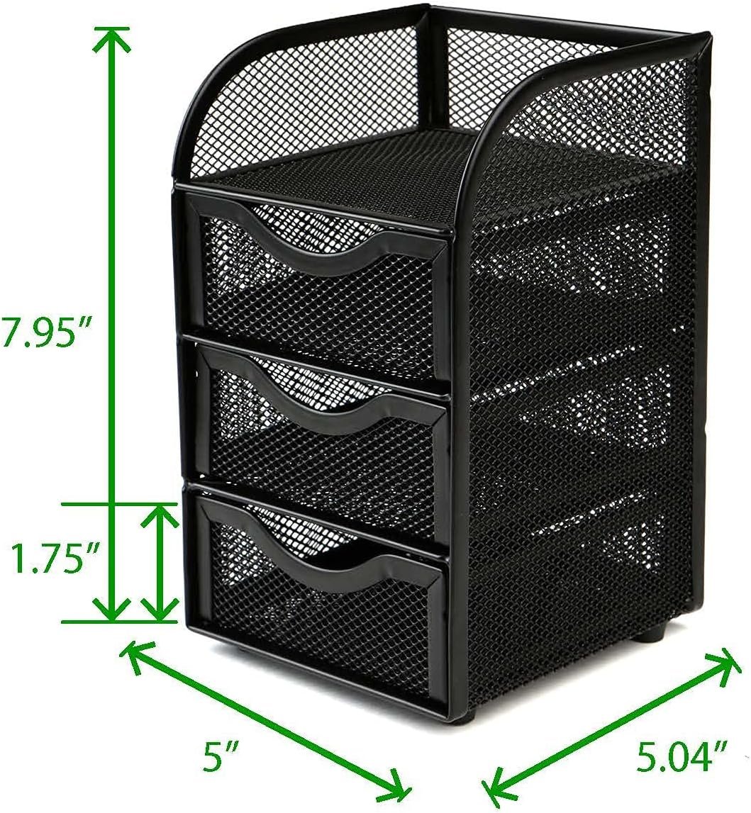 Transform your workspace, makeup table, or kitchen counter with this versatile and stylish black wire mesh organizer. Designed to eliminate clutter and save space, this multi-section organizer features pull-out drawers to store and sort various items, from office and school supplies to jewelry, makeup, crafting gear, or kitchen condiments.