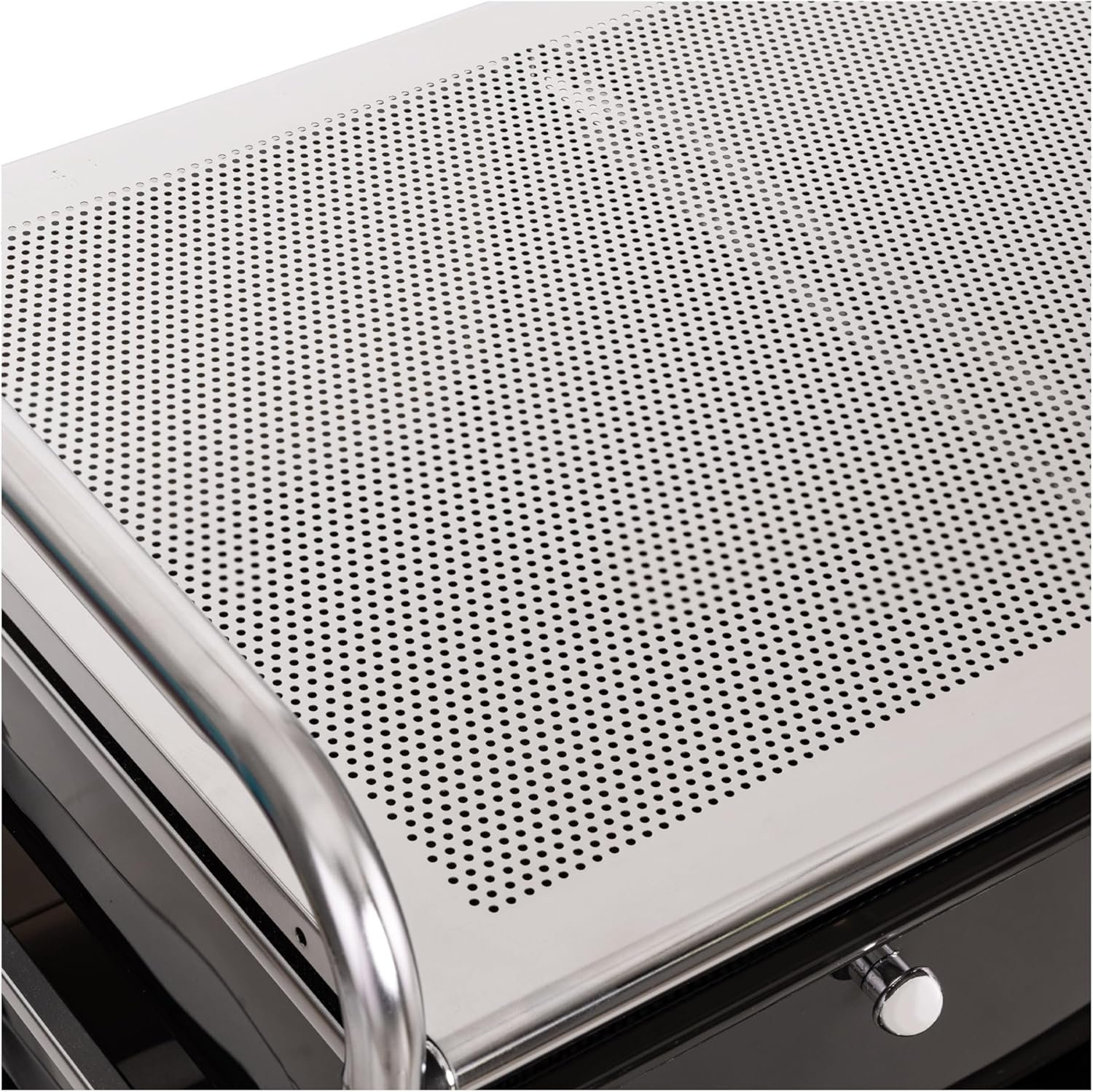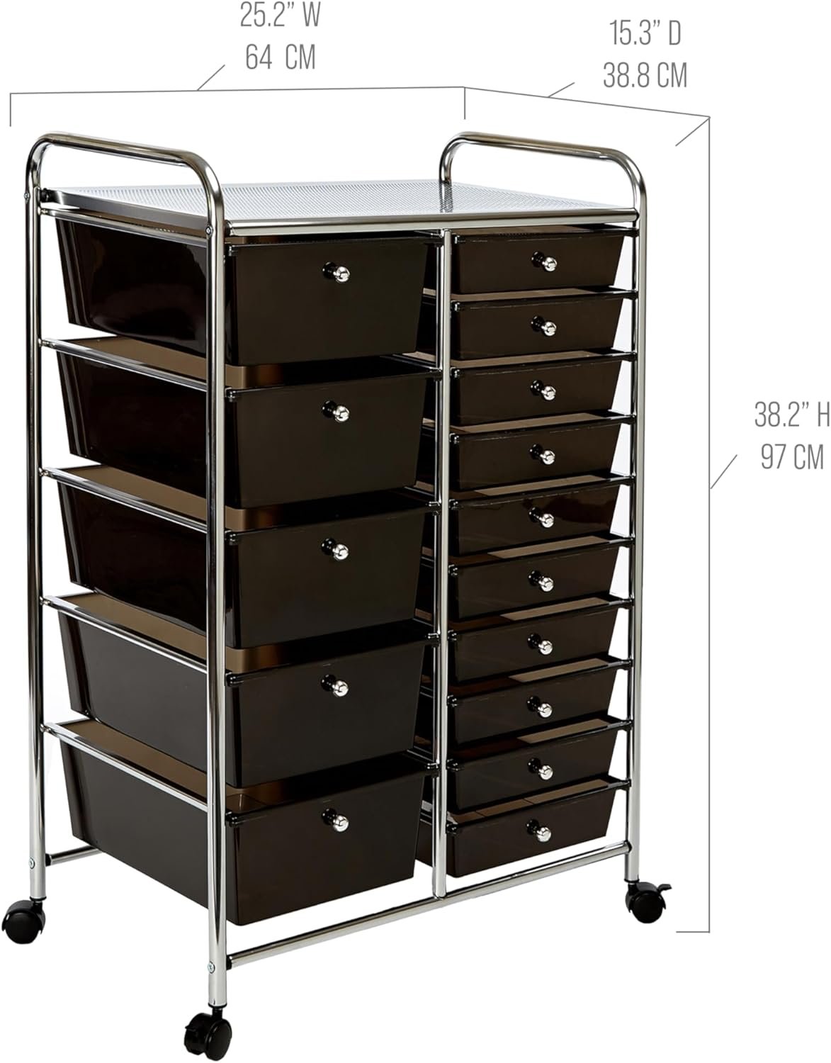 Save space with Seville Classics 15-Drawer Organizer Cart. Constructed with industrial-strength tubular steel finished in chrome, the cart features tall, easy-to-grab handles and a removable perforated steel top shelf. Cart includes 15 removable polypropylene drawers in opaque black with chrome drawer pull knobs. Get organized with 10 smaller drawers and 5 large drawer bins, making it perfect for storing both lightweight and bulky supplies. The interior of each drawer measures 15.2 inches long and 11.25 inches wide–deep enough to hold a ream of printer paper with space to spare. Each drawer can hold up to 3.3 lbs. while the top shelf can withstand up to 16.5 lbs. Remove drawers and re-order them as needed for an organization solution that works for you. Use it as a makeup organizer or as arts and crafts storage. Fill it with notepads, binders, staples, and other ssupplies next to your desk as an office storage cart. The cart includes four 1.5-inch casters with two that lock, so the cart goes where you need and stays where you put it. This convenient organizer is ideal for use in the dorm room, classroom, office, bedroom, bathroom, kitchen, garage or workspace. * 15 opaque black polypropylene drawers with chrome drawer pull knobs * Industrial-strength tubular steel frame with flat straight handles * Chrome finish provides necessary corrosion resistance in dry environments * Includes removable perforated steel top shelf * Includes 4 casters with 2 locking * Drawers are easy to clean with soap and a damp cloth; wipe away excess water and let air dry * Dimensions: 25.2″ W x 15.3″ D x 38.2″ H * Capacity per drawer: 3.3 lbs. * Capacity on shelf: 16.5 lbs. * Weight: 17.6 lbs. * Model: WEB208