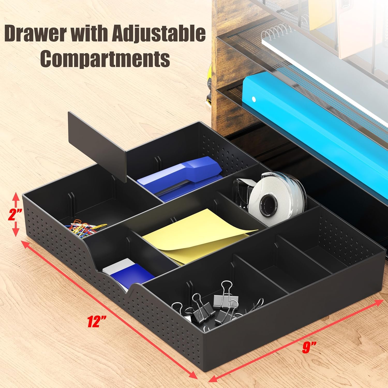 DRAWER WITH ADJUSTABLE DIVIDERS – The bottom drawer (9″ D x 12″ W x 2″ H) features three fixed main sections and six movable dividers. This allows the internal compartments to be configured to fit small supplies like paper clips and sticky notes