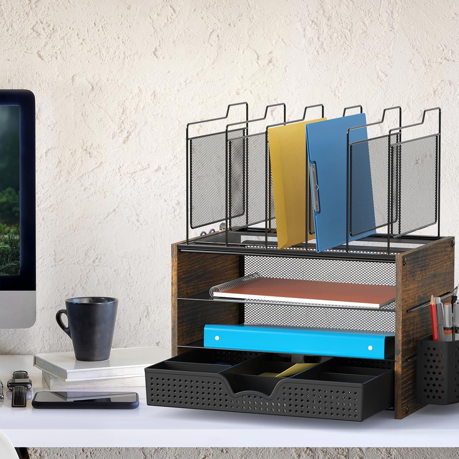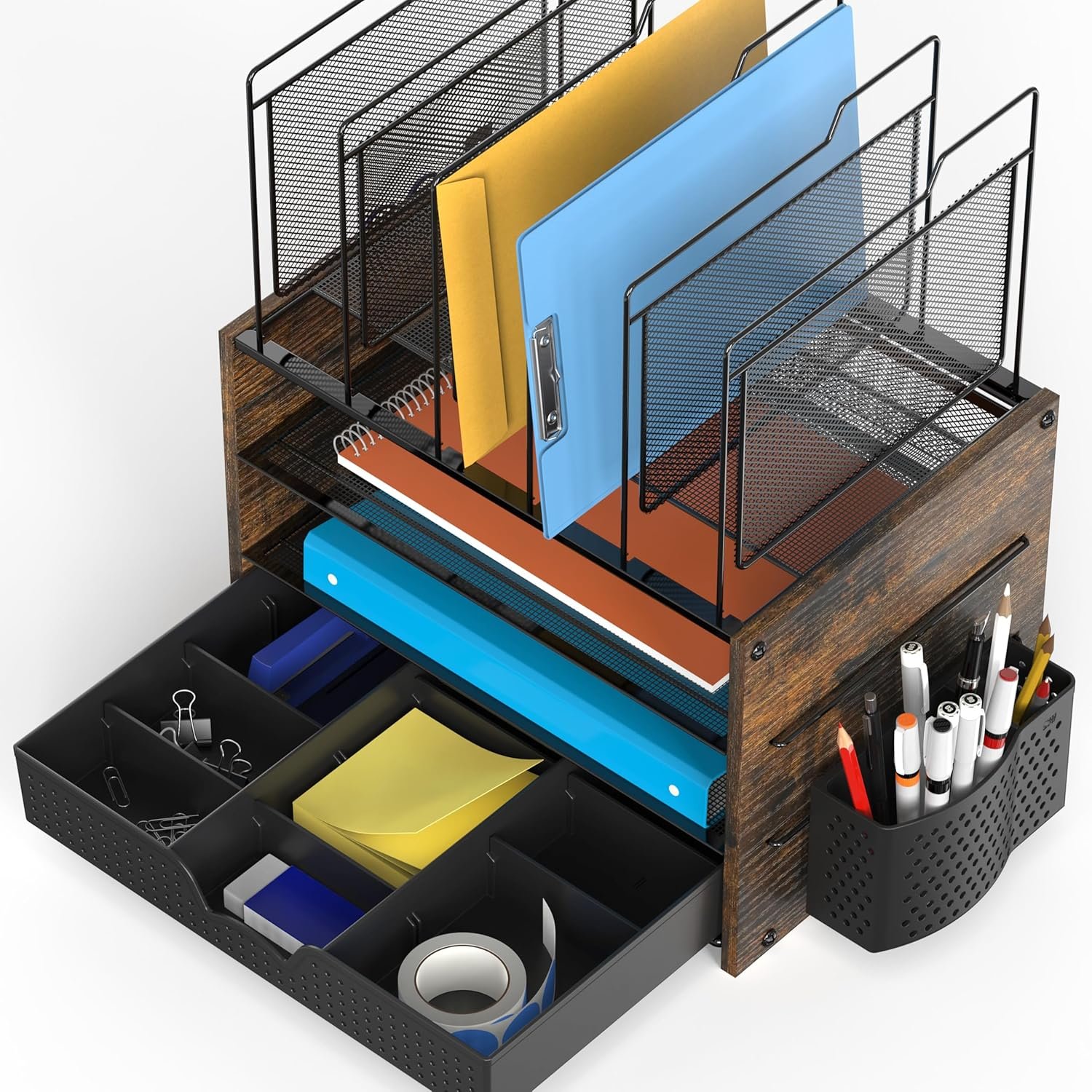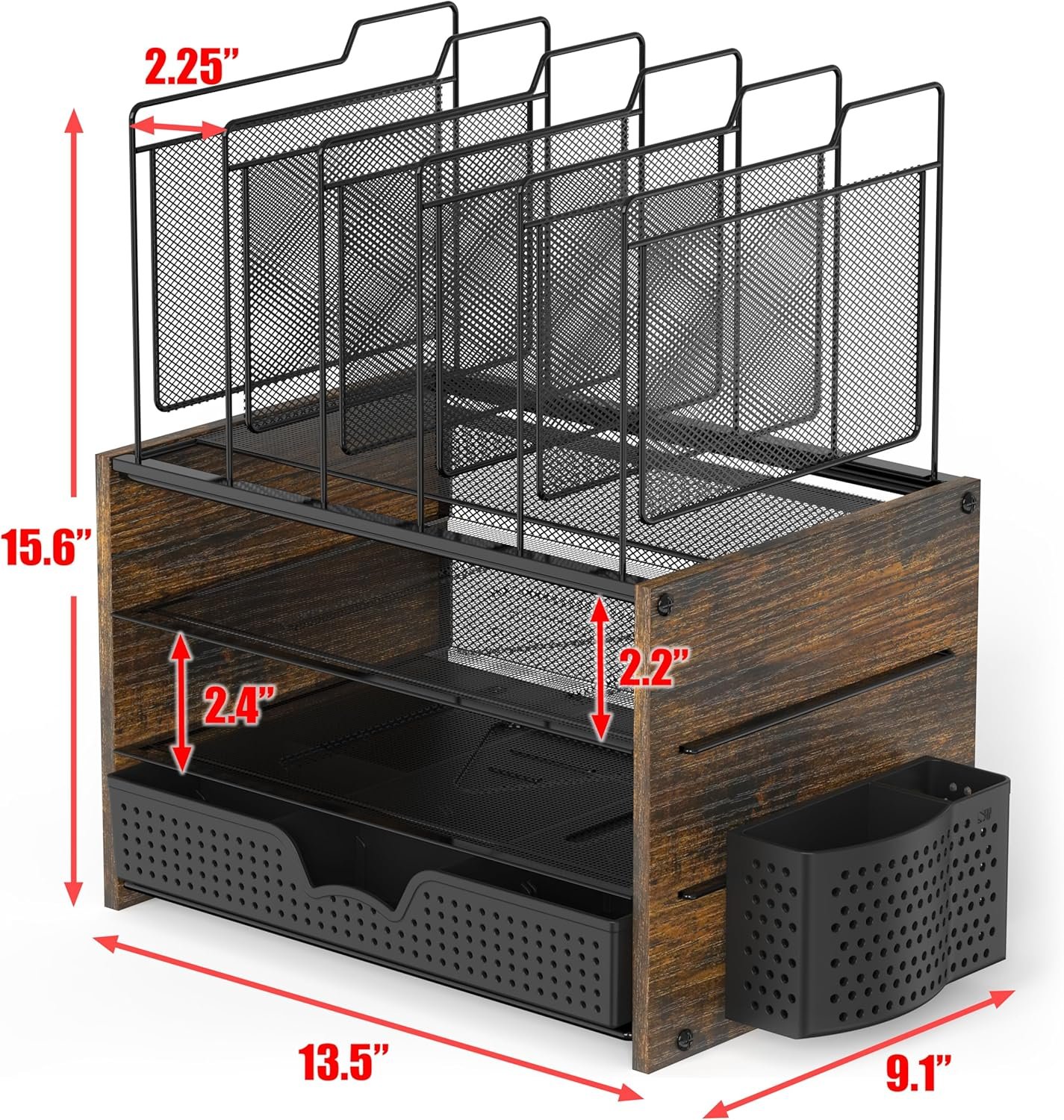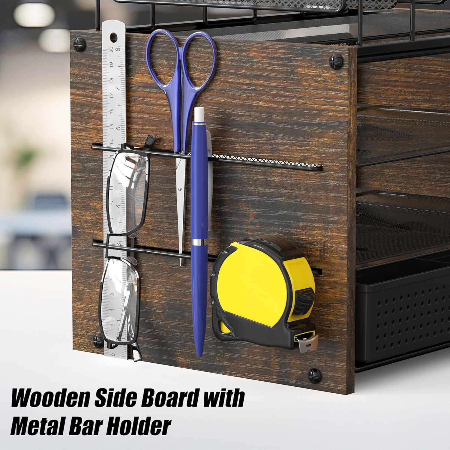 #Simple #Houseware #Mesh #Desk #Organizer #Wooden #Side #Board #Metal #Bars #Shelves #Upright #Sections #Rustic #Brown