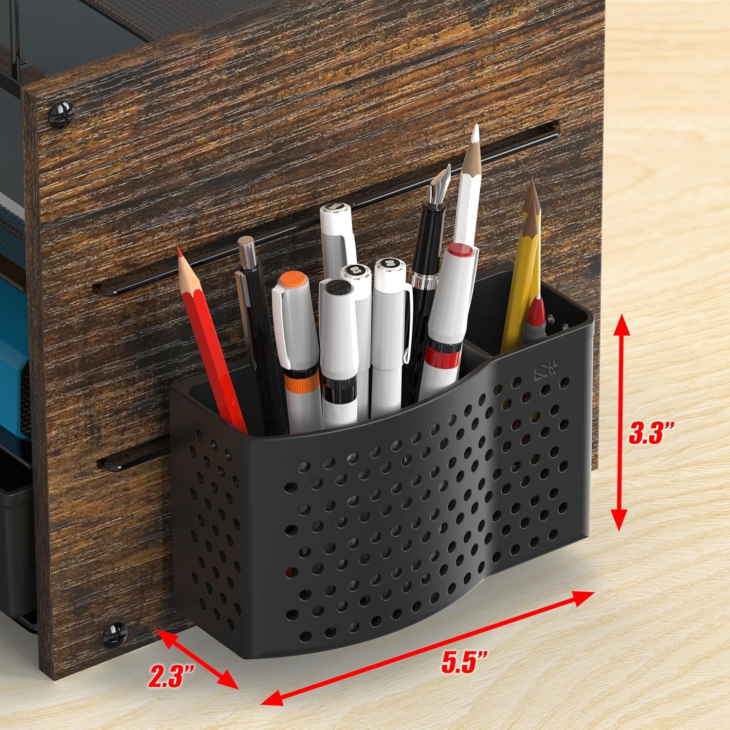 SIDE PANEL & PEN HOLDER – The side panel combines wood with metal wire bars, providing a structure to hang items like glasses or cords. Includes a removable pen bucket (2.3” D x 5.5” W x 3.3” H) that can be positioned as needed