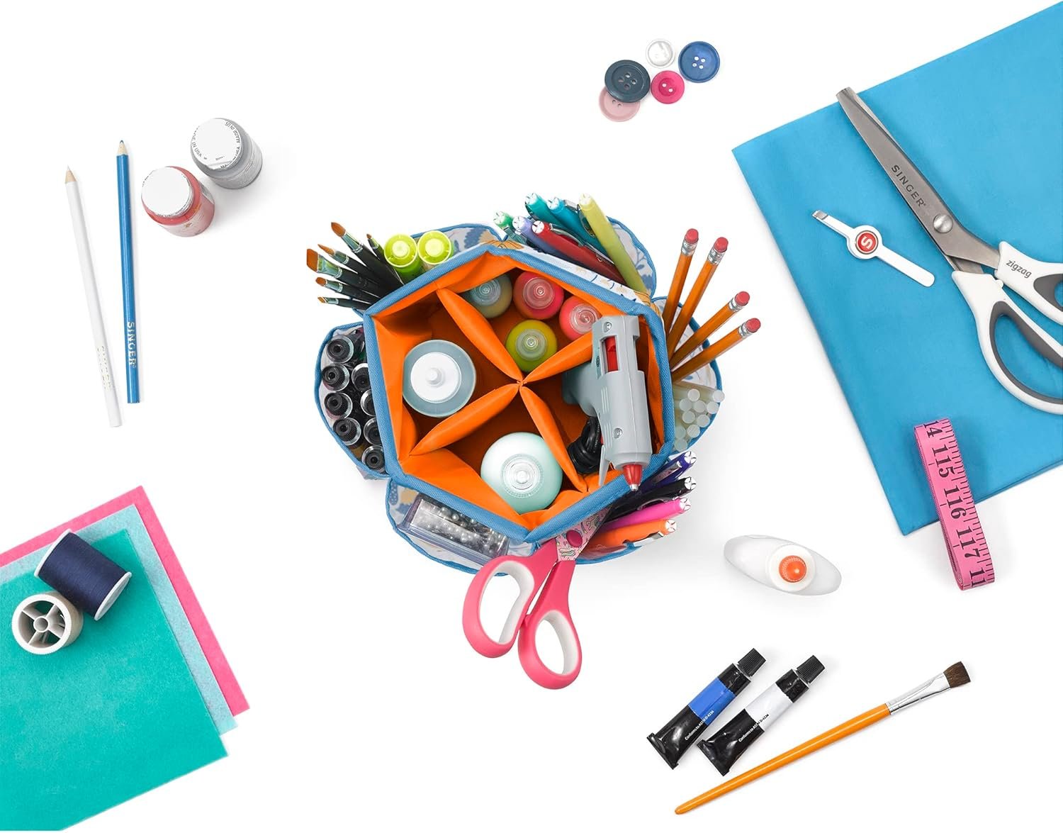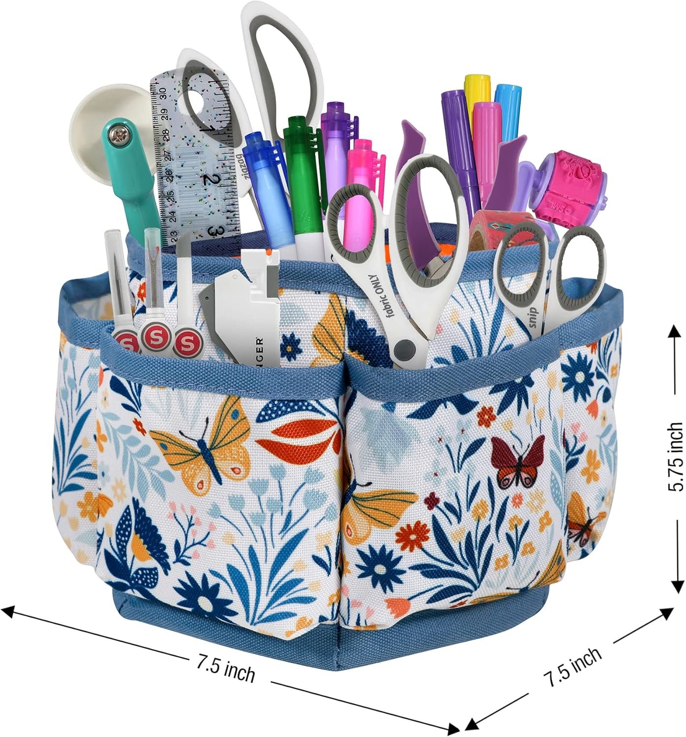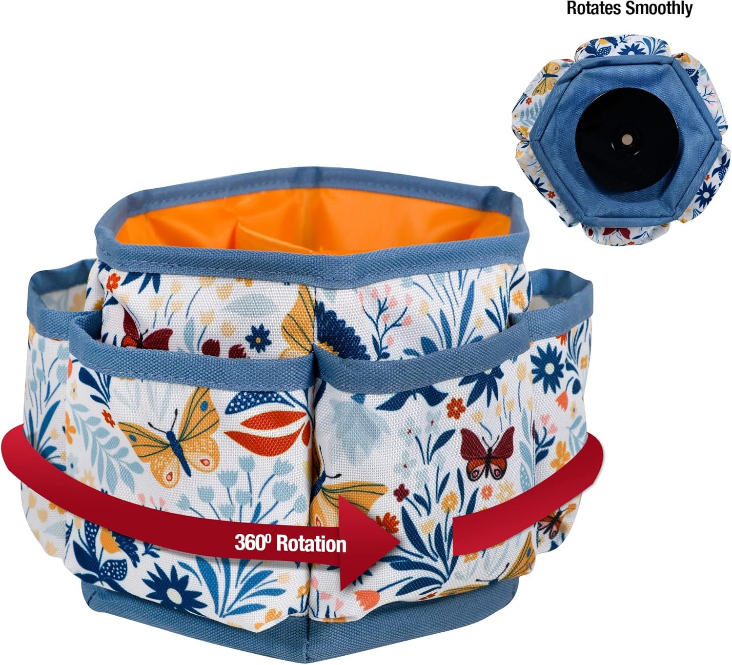 The SINGER Large Sewing Storage Desktop Spinner in Butterfly Floral Print is an ideal sewing organizer for durable, easy-to-access storage space. Measuring 7.5” by 7.5” and standing 5.75” high, this spinning sewing organizer can be placed on a sewing machine console, desk, counter, table, or any flat surface to organize an assortment of sewing supplies, accessories, and tools. The spinner is covered in a high-quality polyester fabric that is stylish and easy to clean, and its rotating base makes it easy to turn so that you can pick out whatever tool or accessory you need. It features yellow and red butterflies in the midst of an assortment of flowers, complemented by a solid orange interior lining and blue trim. The organizer is evenly divided into four spacious and padded inner compartments that can be used to securely organize everything from thread spools, needles, and pins to seam rippers, pincushions, and needle threaders. In addition to all the interior space, six open outer pockets offer even more storage space and keep sewing supplies such as buttons, thimbles, and small sewing tools neat and organized. This versatile storage spinner also doubles as a stylish storage container for bobbins, crafting tools, scrapbooking supplies, colored beads, art supplies, costume jewelry, or beauty products. With so many ways it can be used, buy one for each of the areas you want to organize. This is the perfect high-quality sewing storage organizer for spacious tabletop storage, easy-to-reach access, and optimal organization.