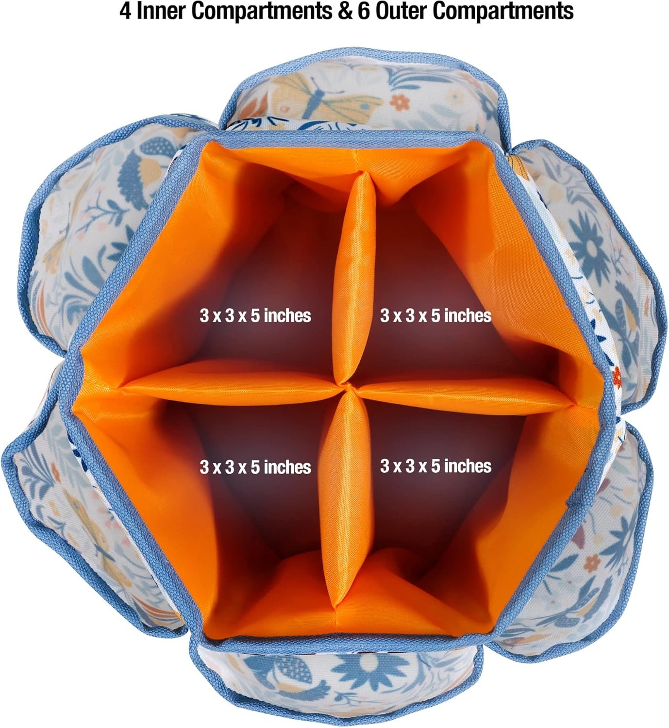 Measuring 7.5” in diameter and standing 5.75” tall, the spinner contains 4 roomy inner storage compartments as well as 6 additional outer pockets to keep needles, thread, sewing notions, and tools neat and organized