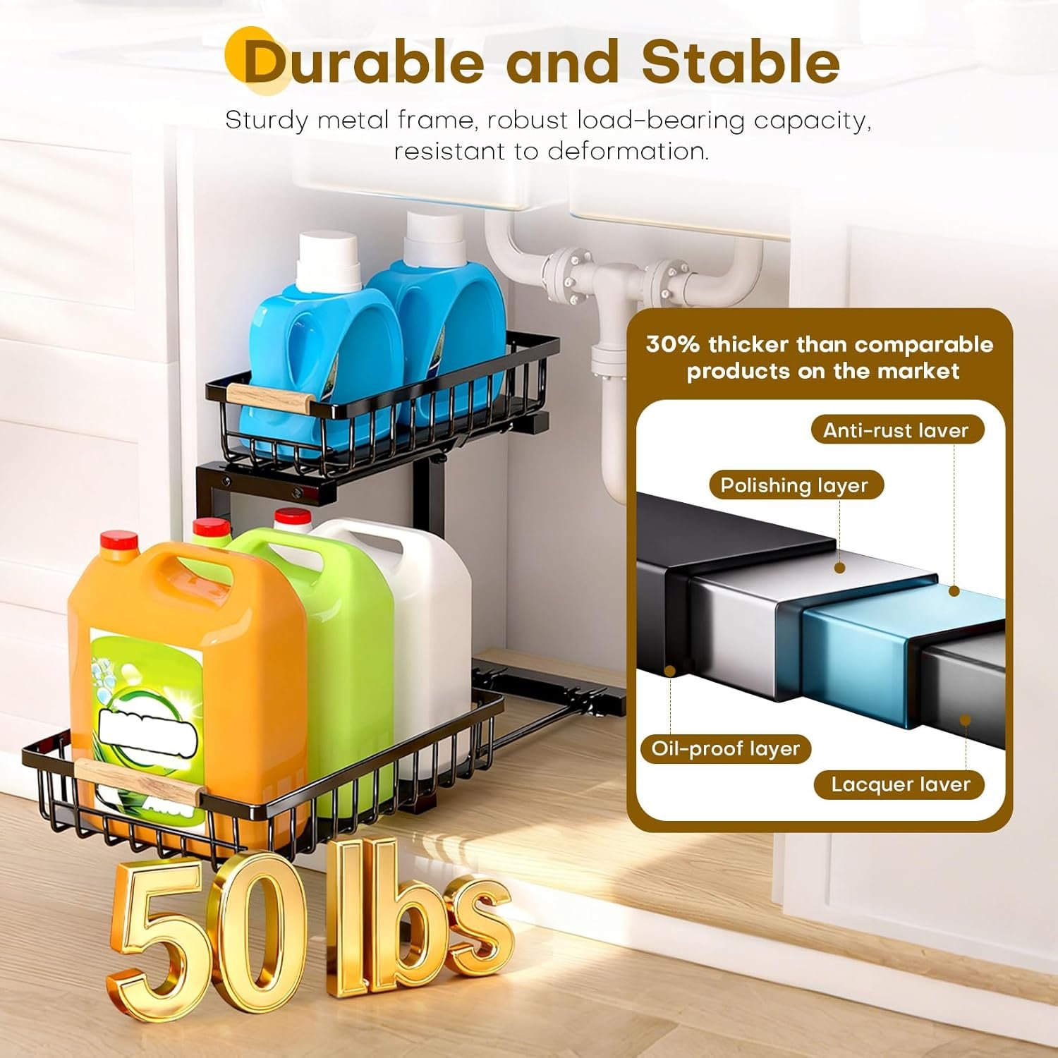 【Heavy-Duty Support】This under sink organizer’s sturdy metal frame provides rock-solid support for up to 50 lbs — enough for 4 full-size laundry detergent jugs plus your essential cleaning supplies.