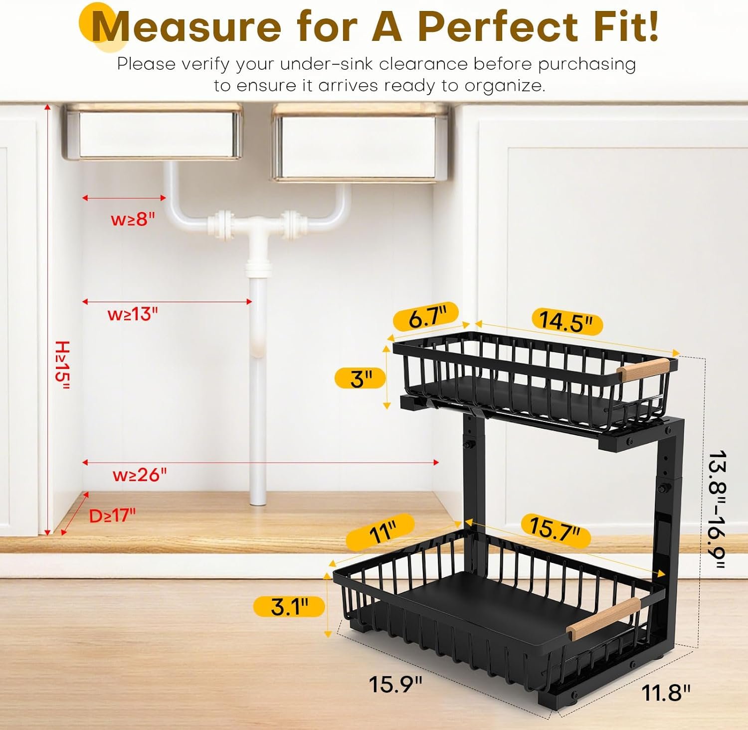 【NOTE】Please ensure your cabinet meets these minimum clearances: W≥26", H≥15", D≥17". A quick check guarantees a perfect fit for your new organizer.