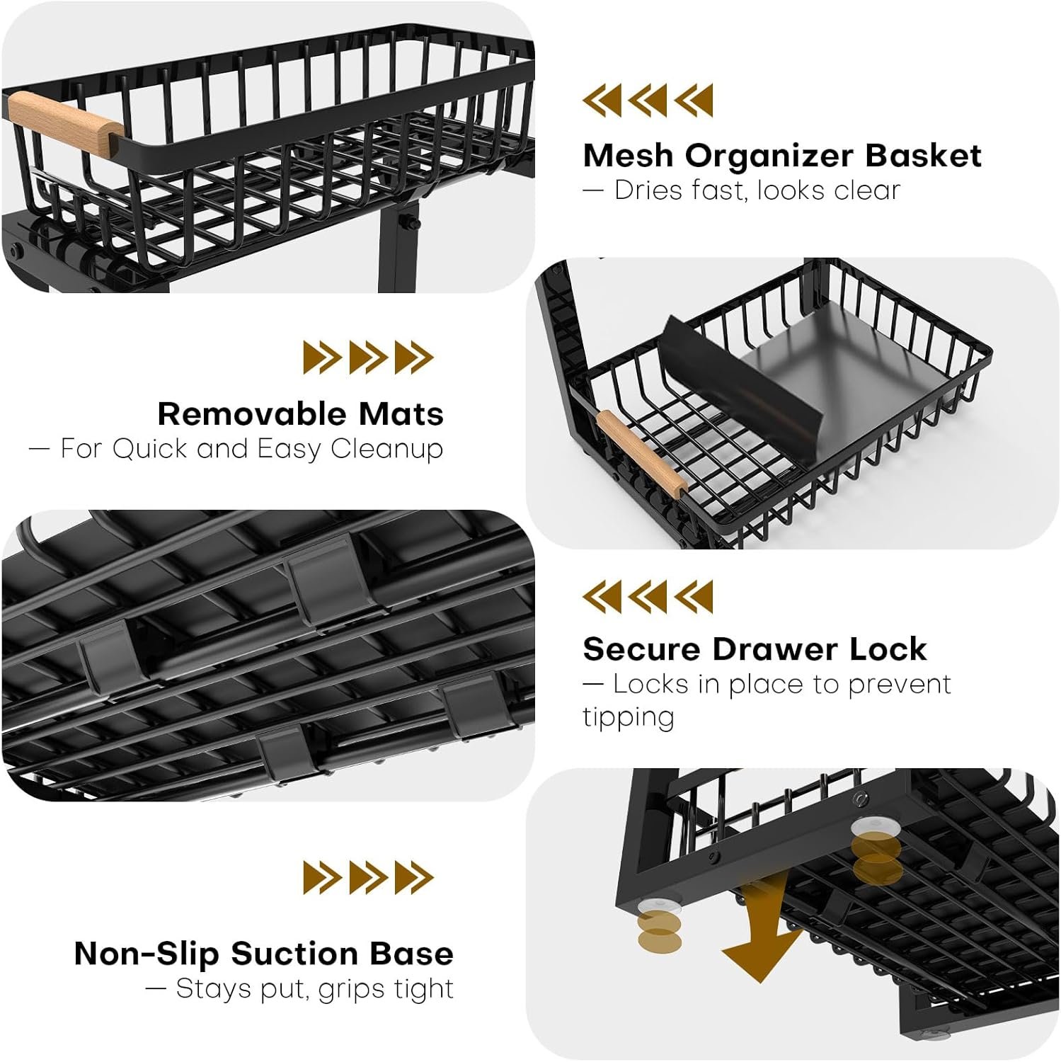 【Won’t Tip Out】8 * Powerful suction cups grip smooth surfaces. The sliding lock secures the drawer against tipping, no matter the weight inside.