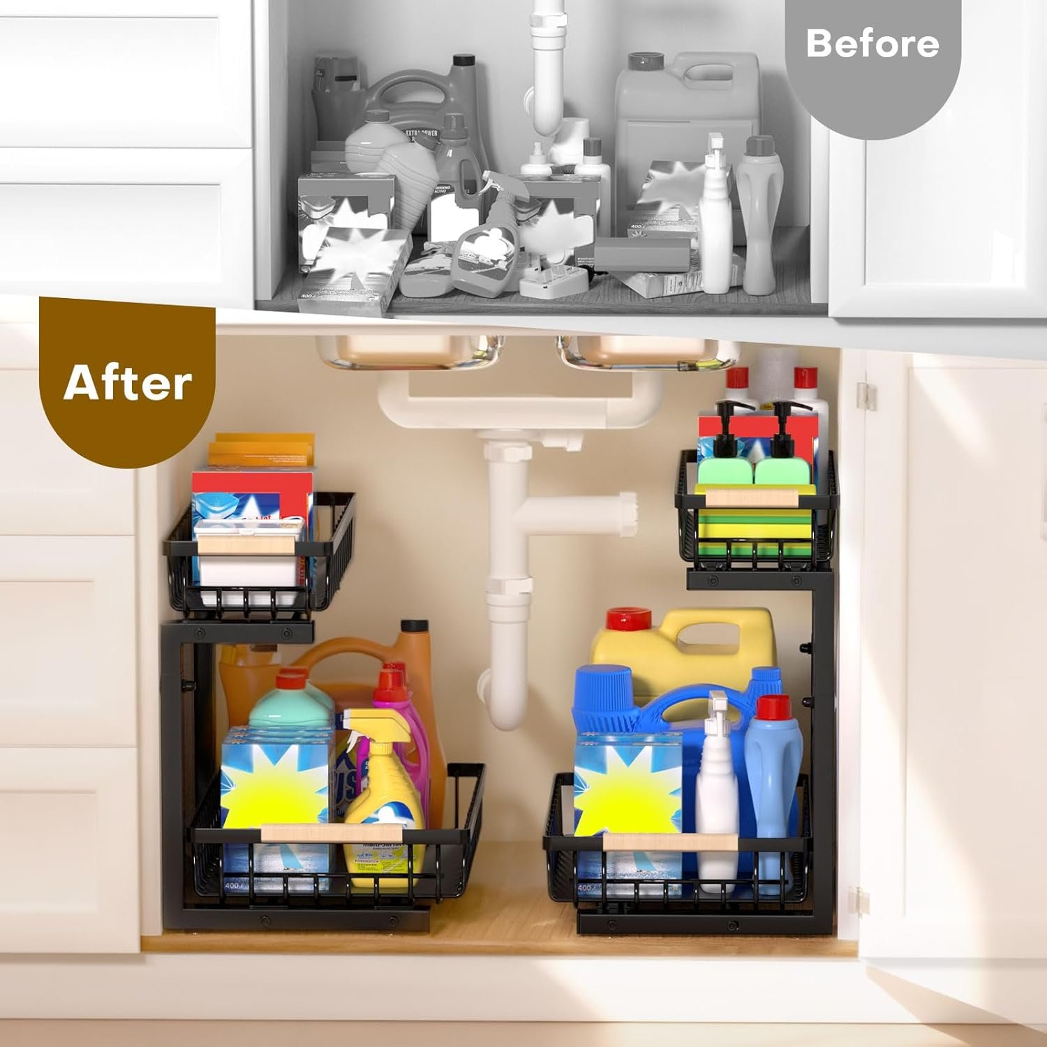 【Get 200% More Storage】2 Tier cabinet organizer makes full use of your under sink’s vertical space. Pull out drawers bring every item forward, no more searching through deep, forgotten corners.