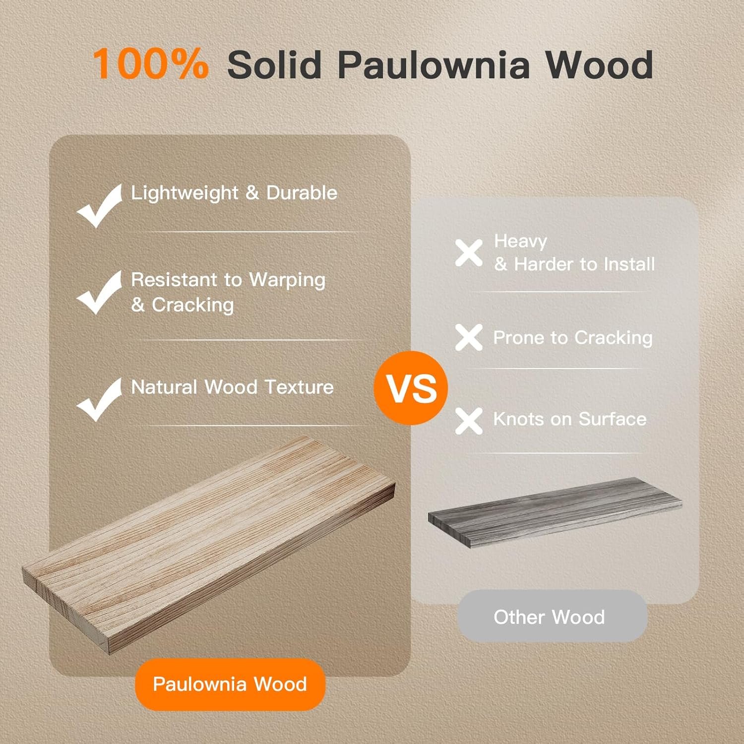Solid Paulownia Wood: Our floating shelves are crafted from 100% paulownia wood with a fine wood grain and attractive finish. Paulownia wood is naturally resistant to decay, warping, and pests, making these bathroom shelves perfect for wall decor in any living space.