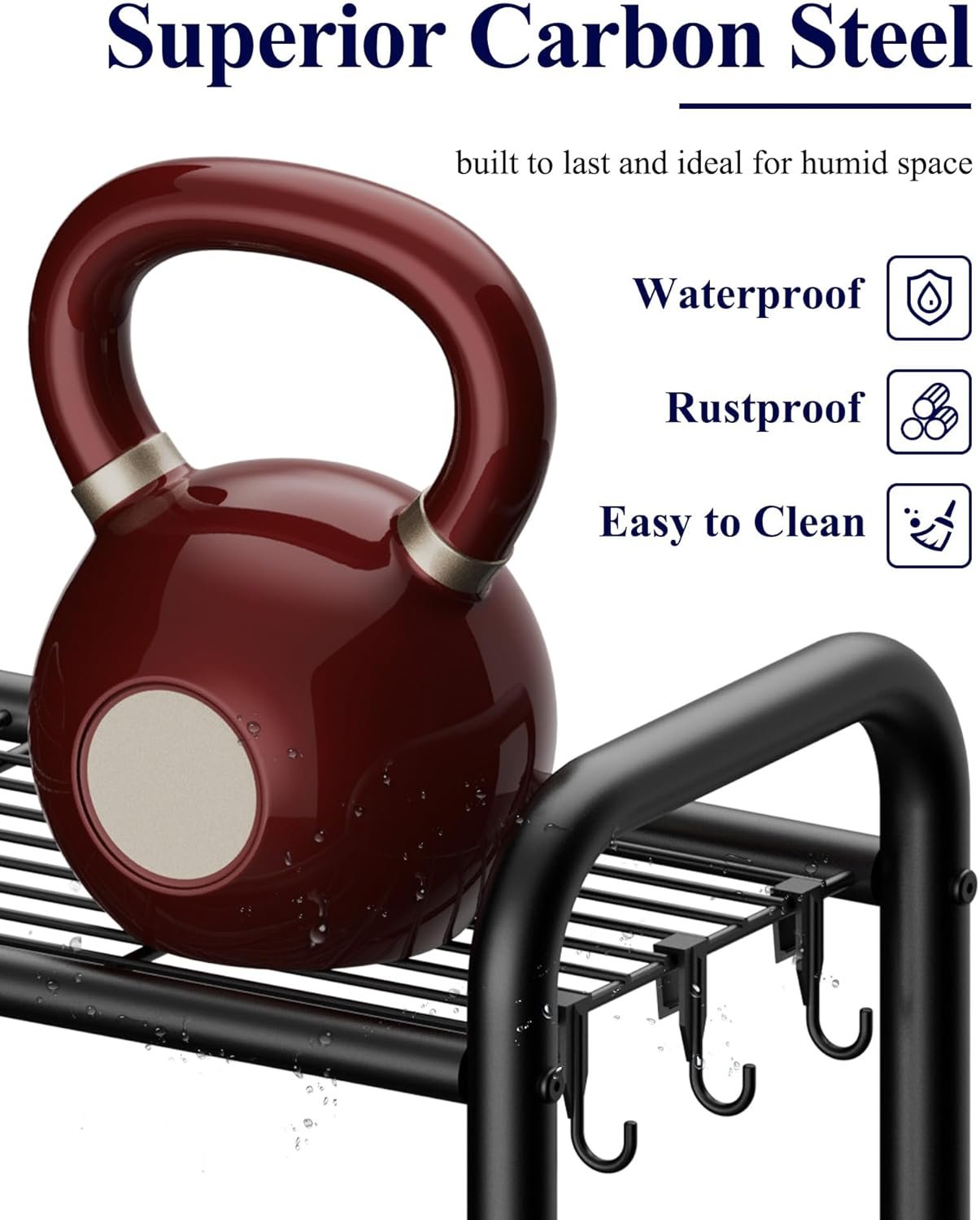 PREMIUM CARBON STEEL: Crafted from high-quality carbon steel, this sturdy bathroom storage rack can support heavy loads without bending or breaking. Its waterproof and rustproof coating ensures reliable performance in humid environments like bathrooms and laundry rooms. It is designed to withstand daily wear and tear for long-term use. Besides, this bathroom decor is easy to maintain by wiping with a damp cloth.