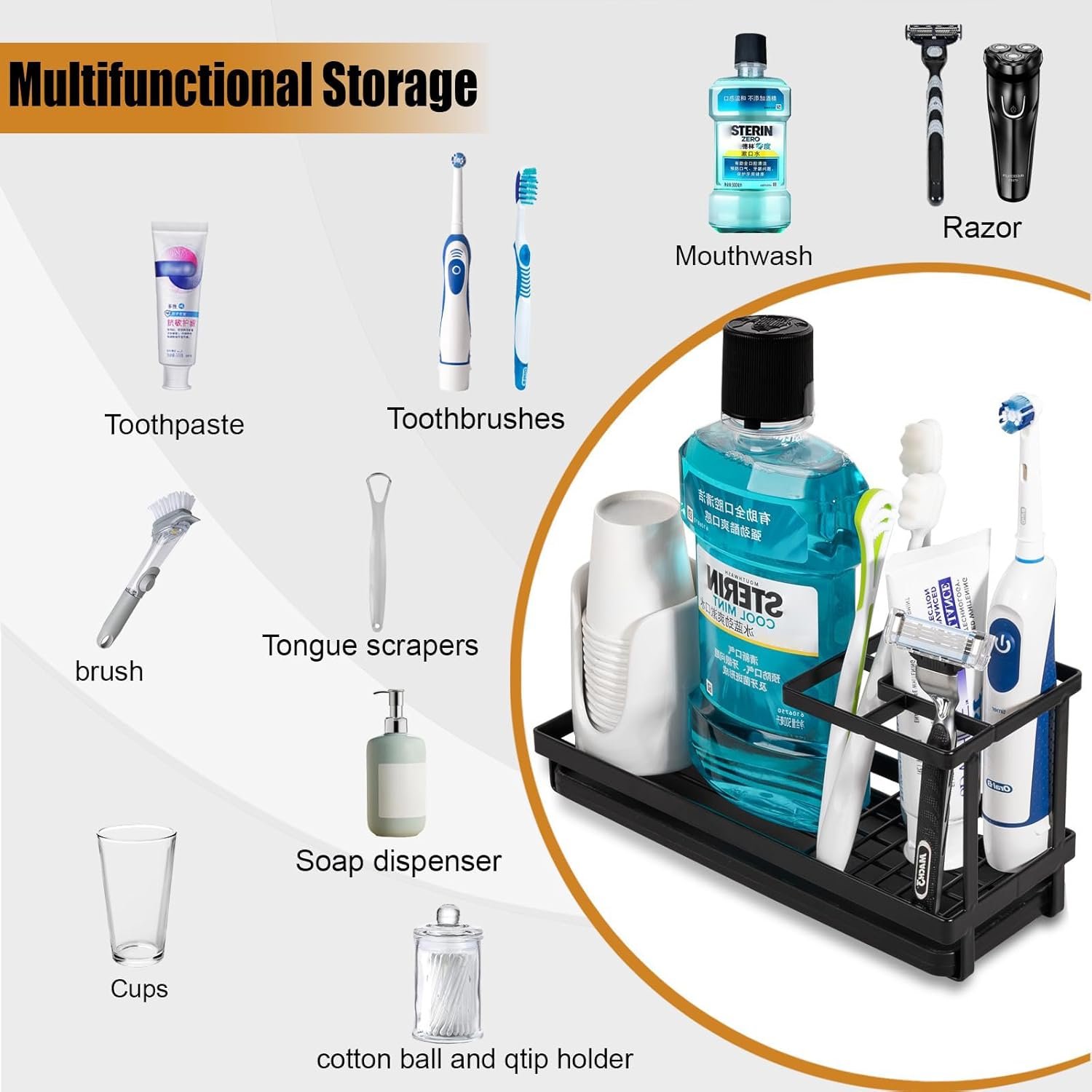 Multiple Compartments Design: This bathroom toothbrush holder set consists of two parts. The left side has 4 slots for conveniently storing your toothpaste, toothbrush, razor, tongue scraper and other oral care gadgets, while the right side has a larger storage space for soap dispensers, mouthwash and other bathroom essentials.