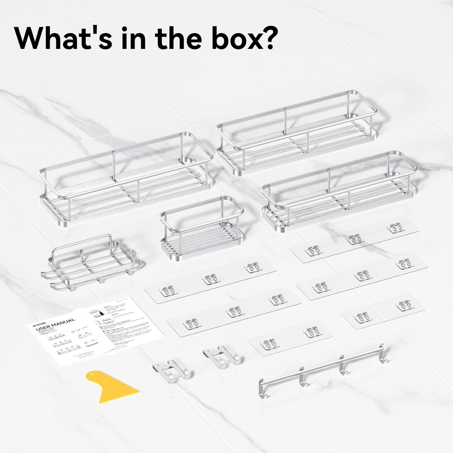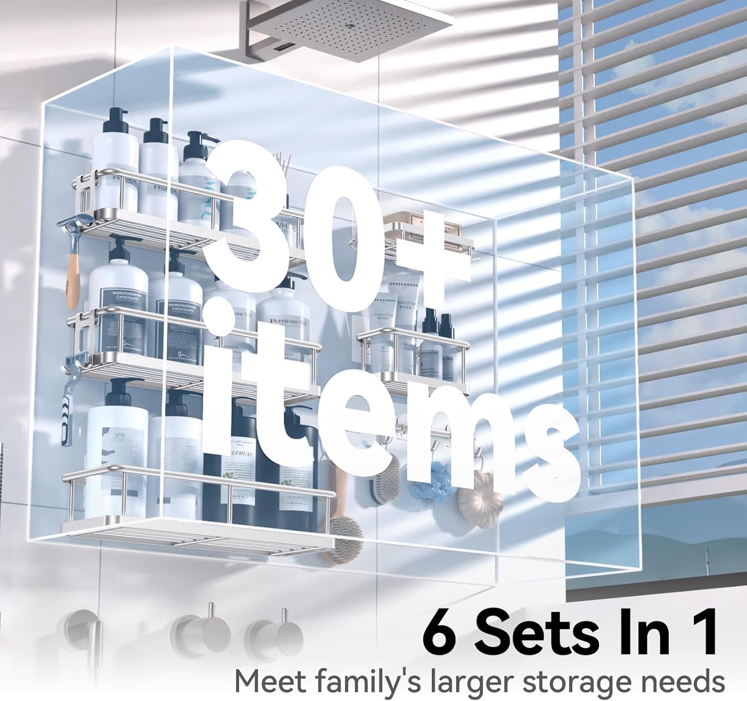 Shower Storage Game Changer: 6-piece large capacity shower organizer set Including large caddy X3, toothbrush holder X1, shower soap holder X1, adhesive shower caddy tape X6, little hook X 2 and a row of hooks. It is a game changer for bathroom organizers and storage, simplifying your life