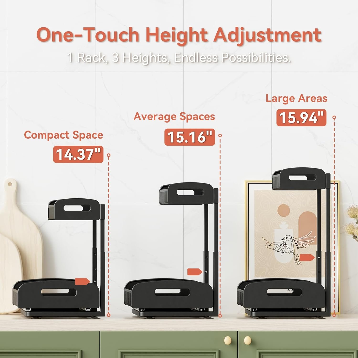 Customize the Fit Under Cabinet Organizer: Easily adjust the rack height between 14.37″ and 15.94″ to match your sink and maximize storage space. Assembled dimensions: 22.05” x 10.43” x14.37”–15.94 ”. The bottom can hold bottles up to 10 inches in height. (Note: Please measure before ordering.)