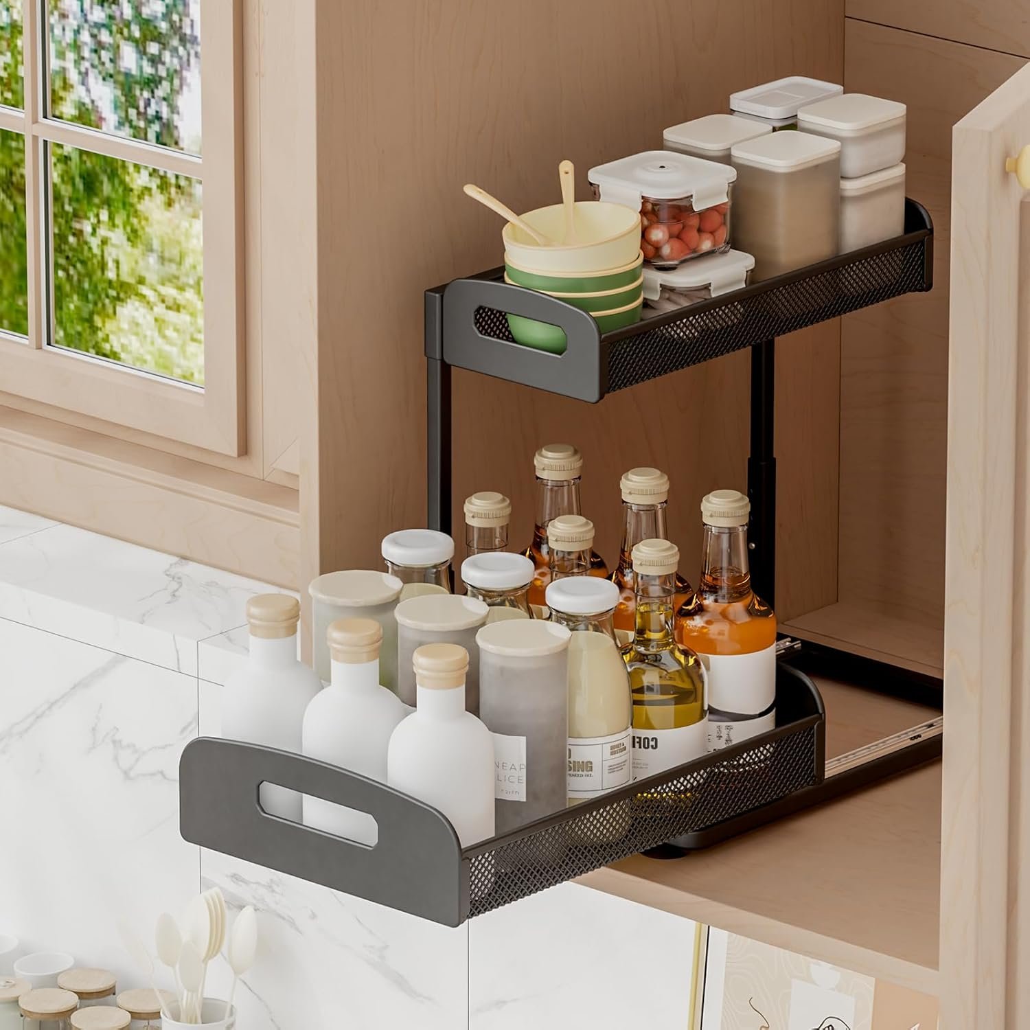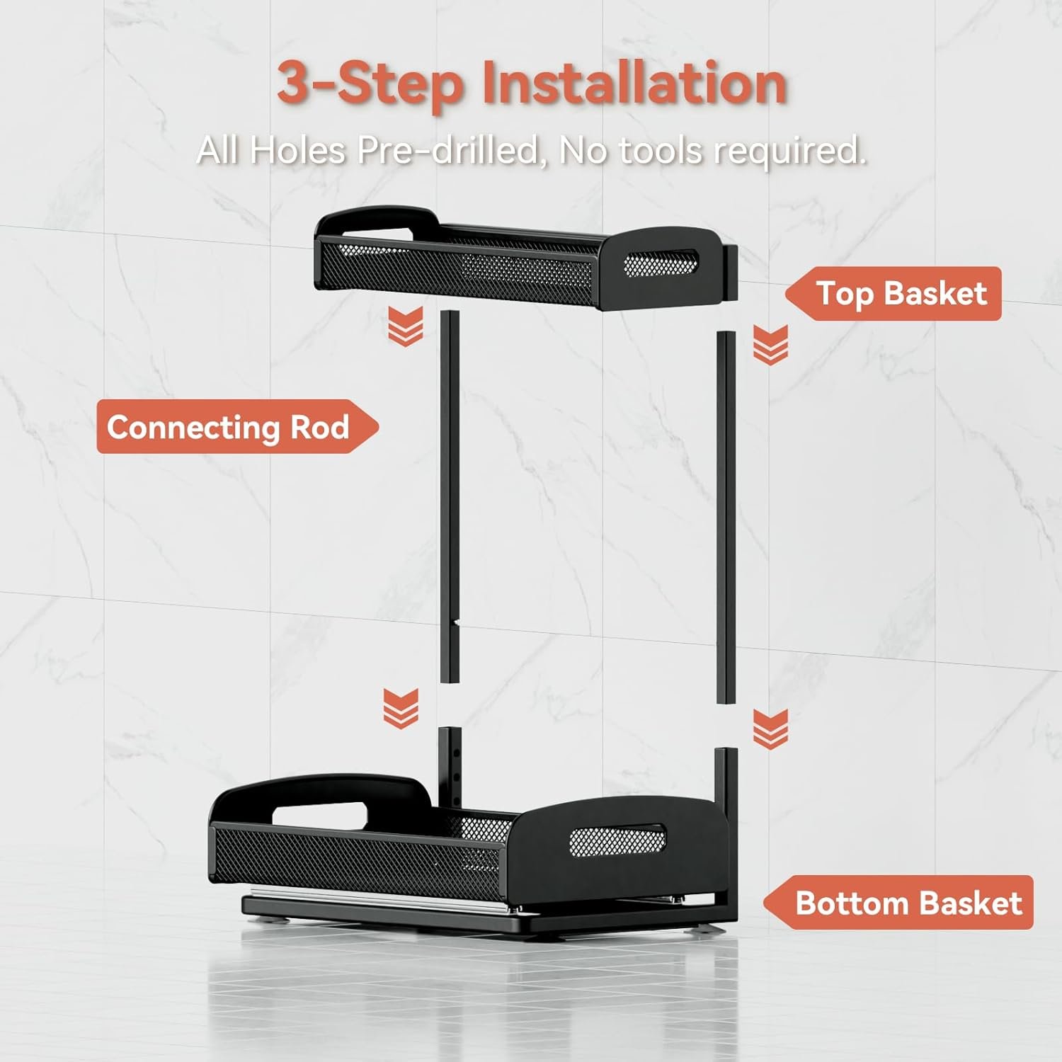 Smart L-Shaped Pull-Out Drawer: No more digging around in the back of your cabinet! The innovative L-shaped under sink organizer rack design—narrow on top, wider at the bottom—creates extra space for tall bottles while the metal-glide drawer slides out smoothly for easy access. Built-in handle makes it effortless to open, even when your hands are full